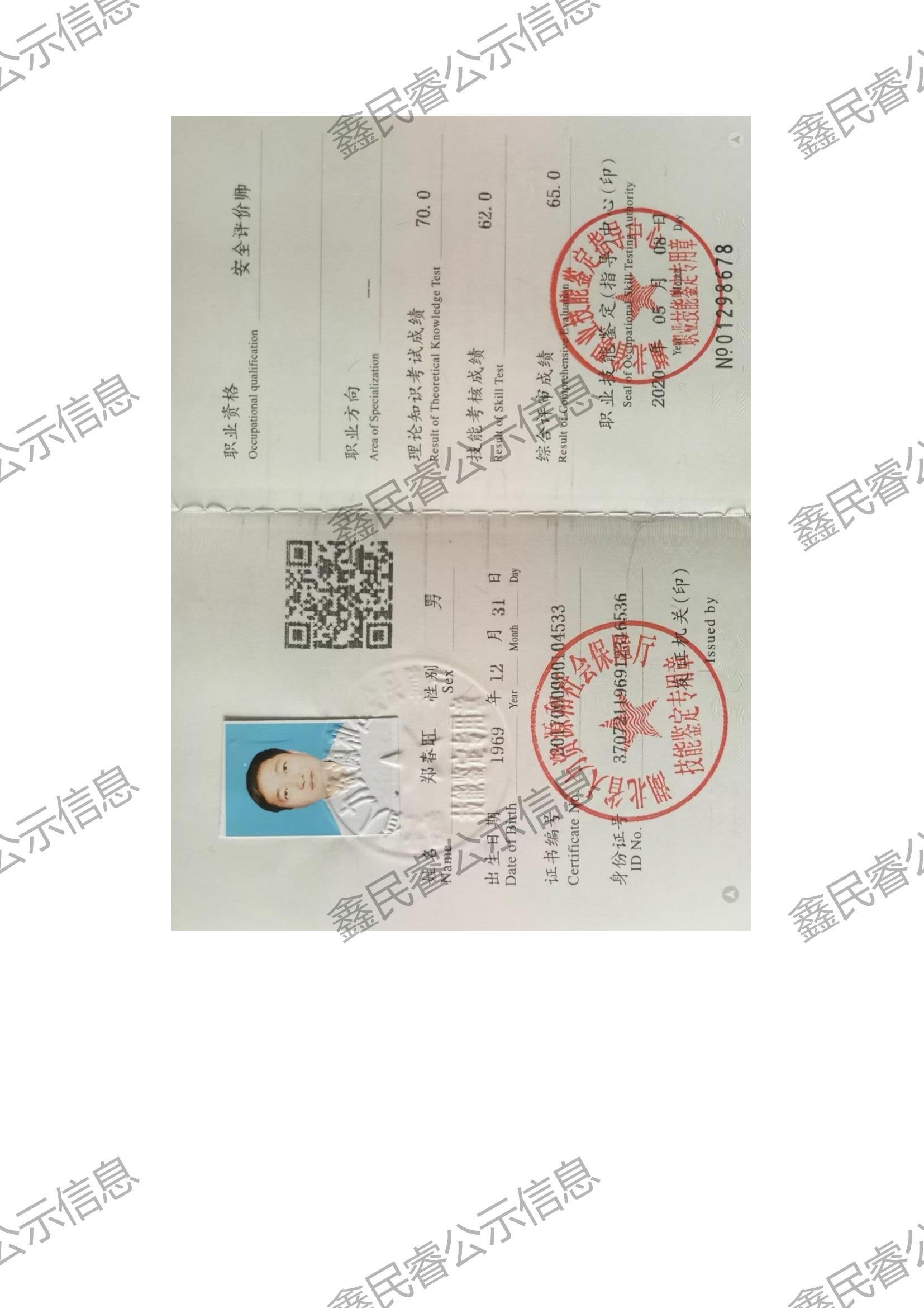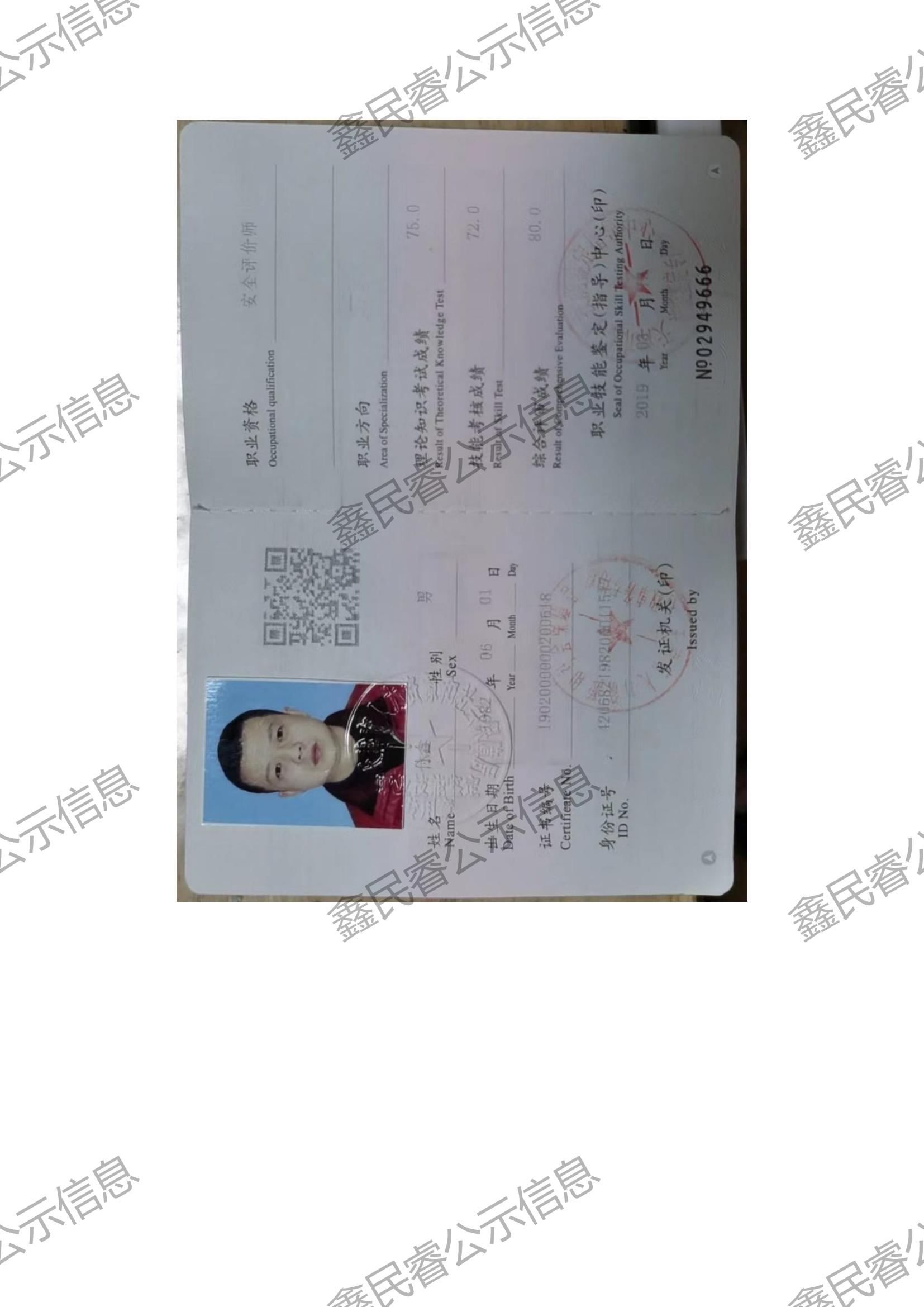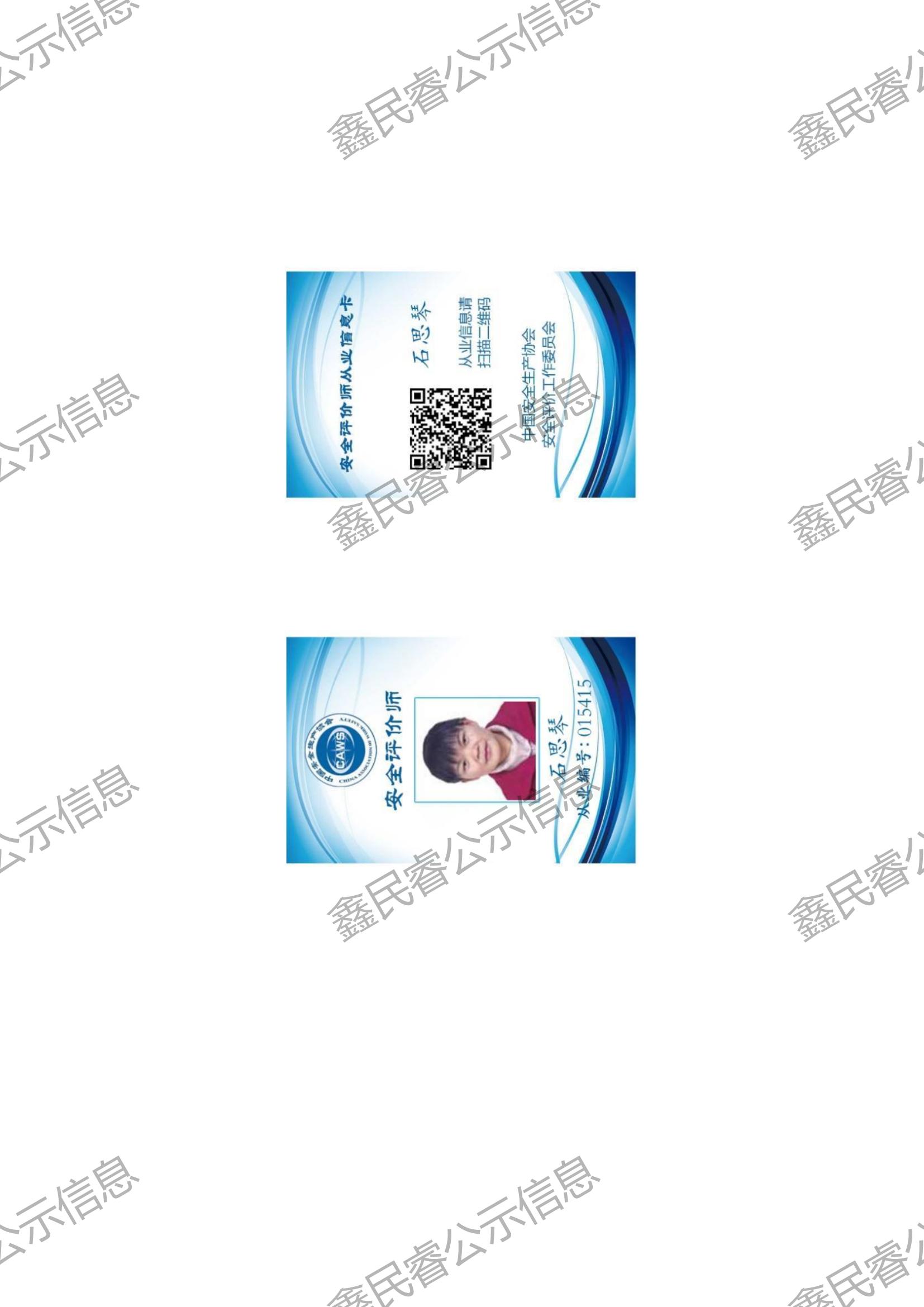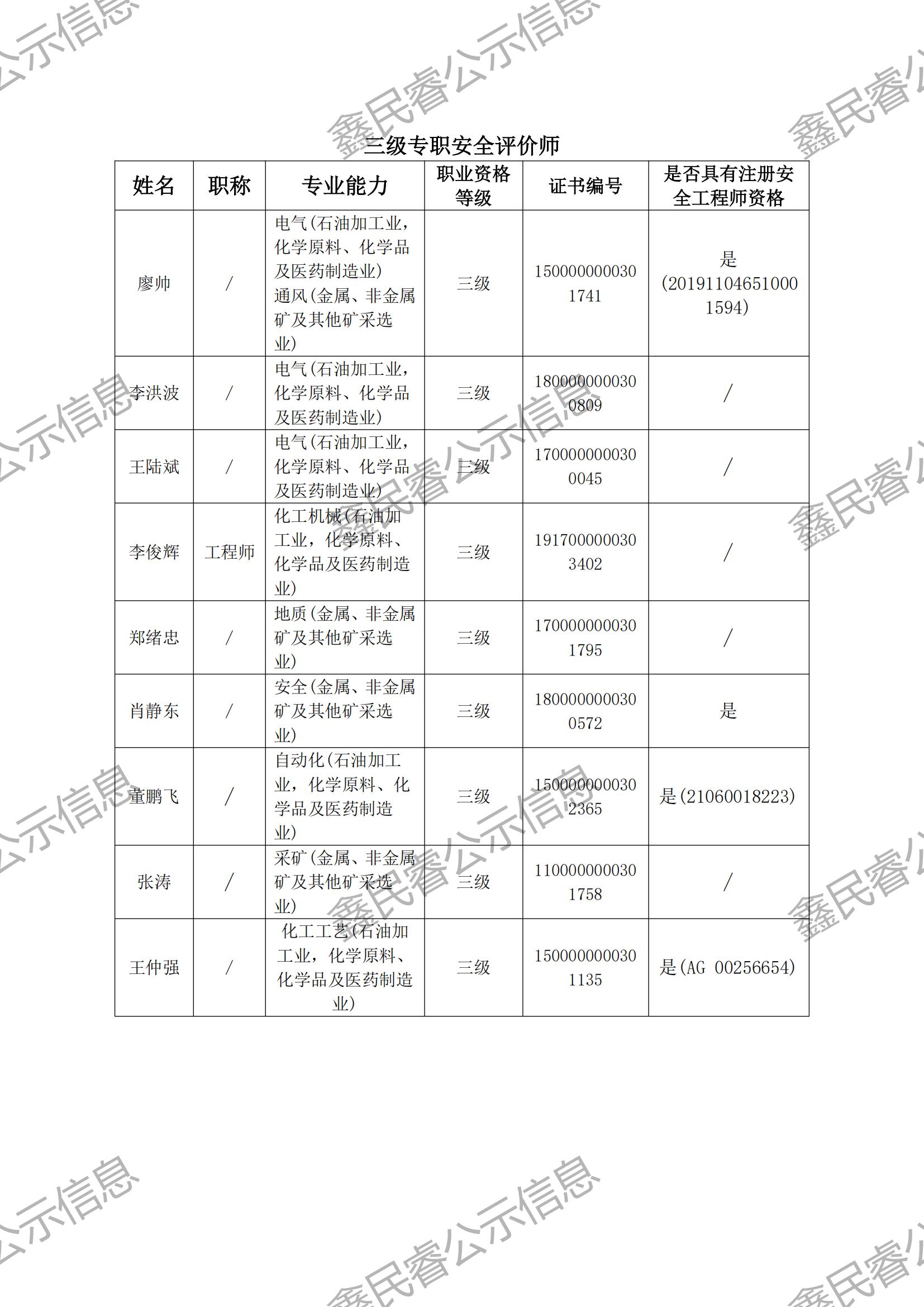 我公司鑫民睿专职安全评价师、注册安全工程师信息公示: