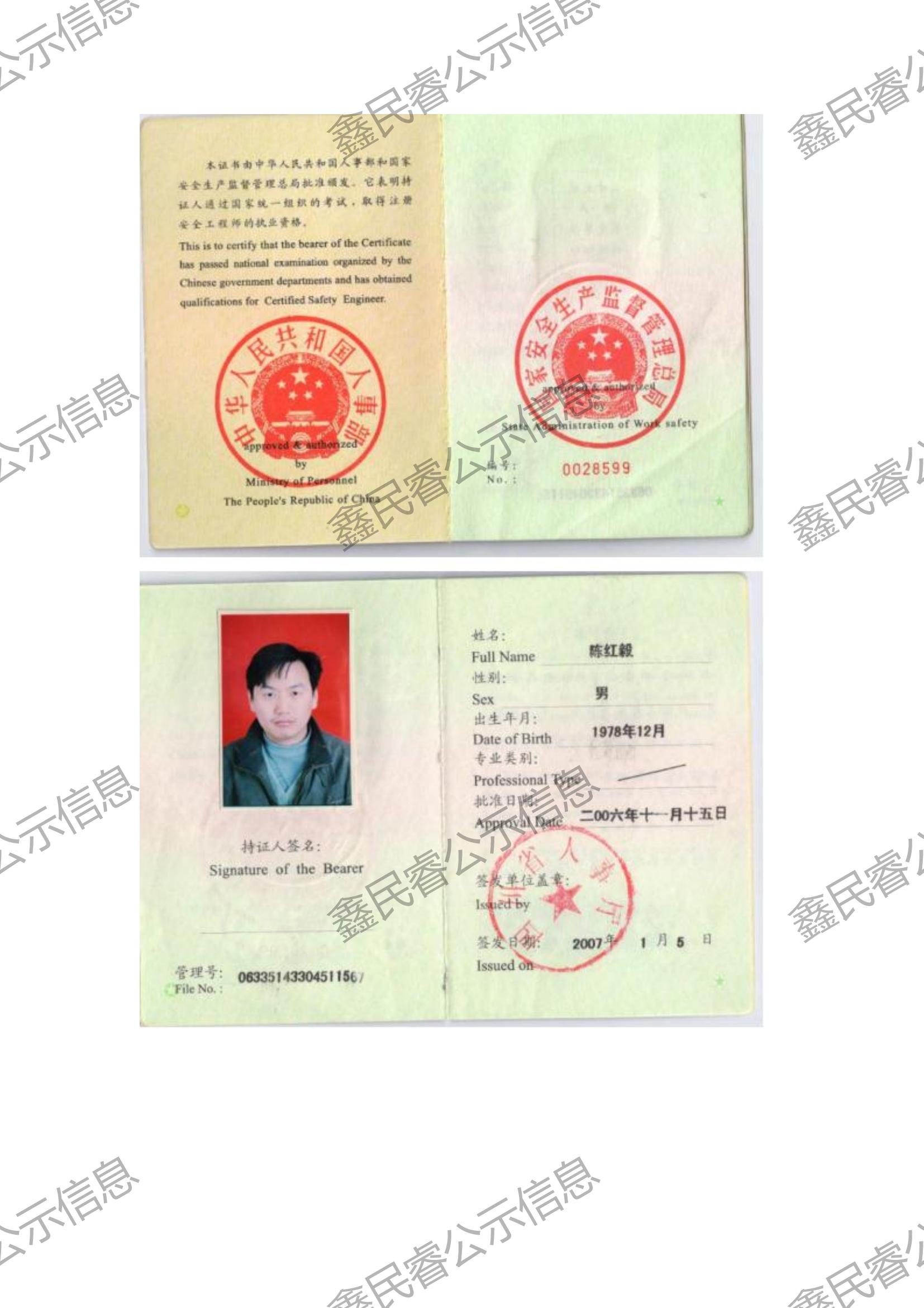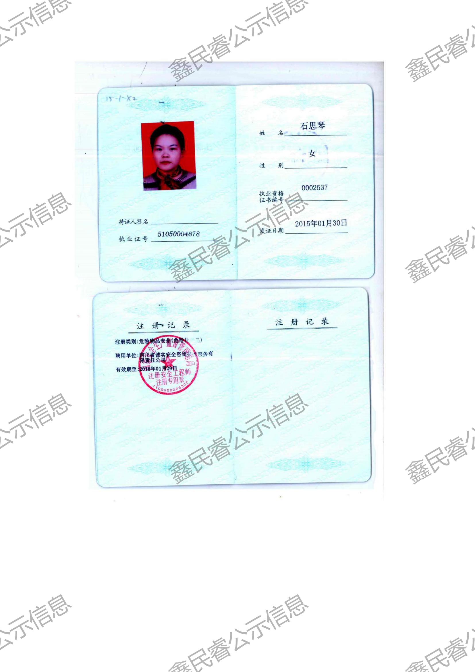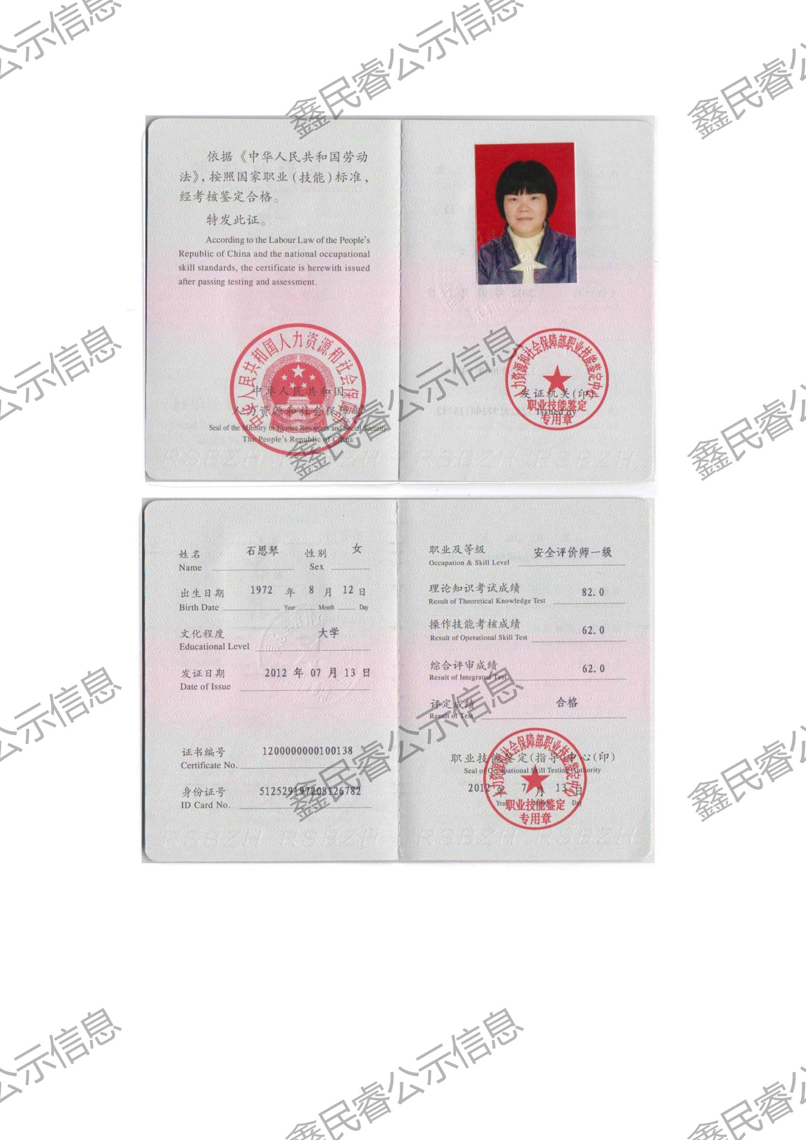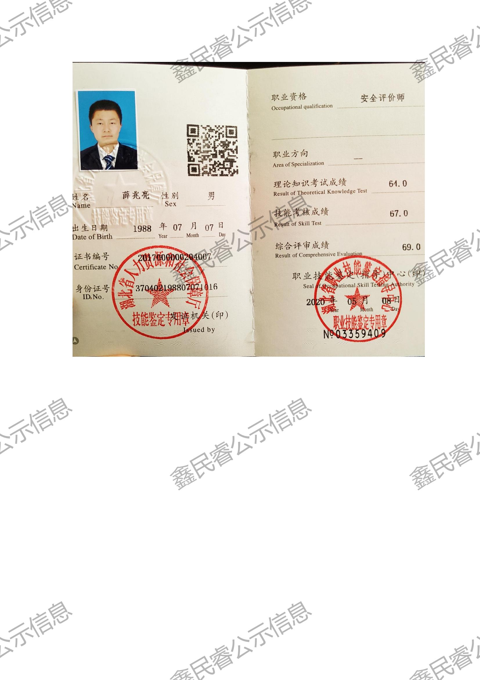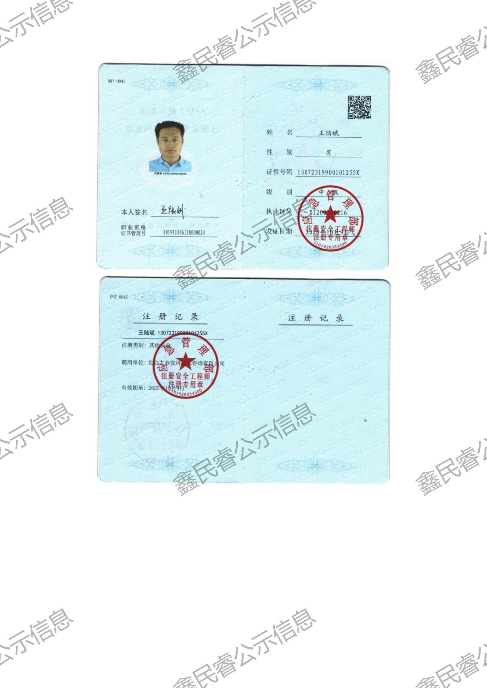我公司鑫民睿专职安全评价师、注册安全工程师信息公示: