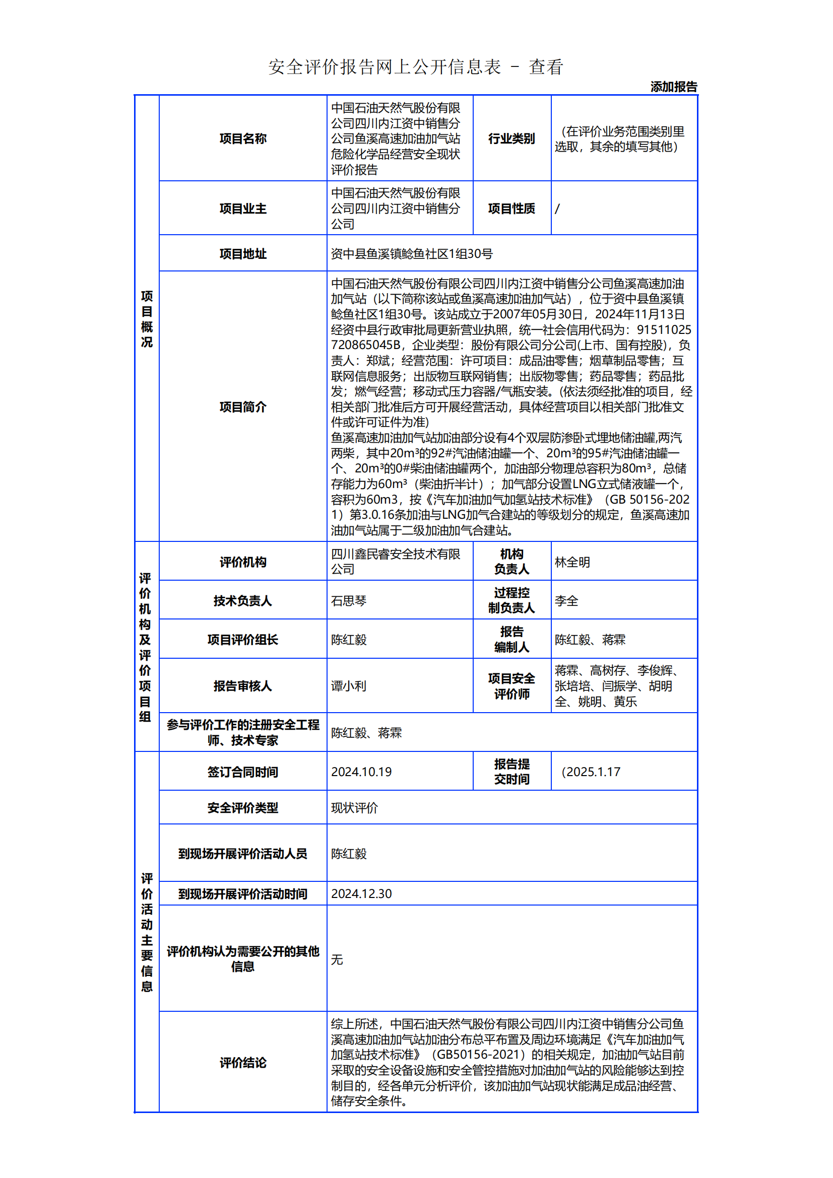 141中国石油天然气股份有限公司四川内江资中销售分公司鱼溪高速加油加气站危险化学品经营安全现状评价报告