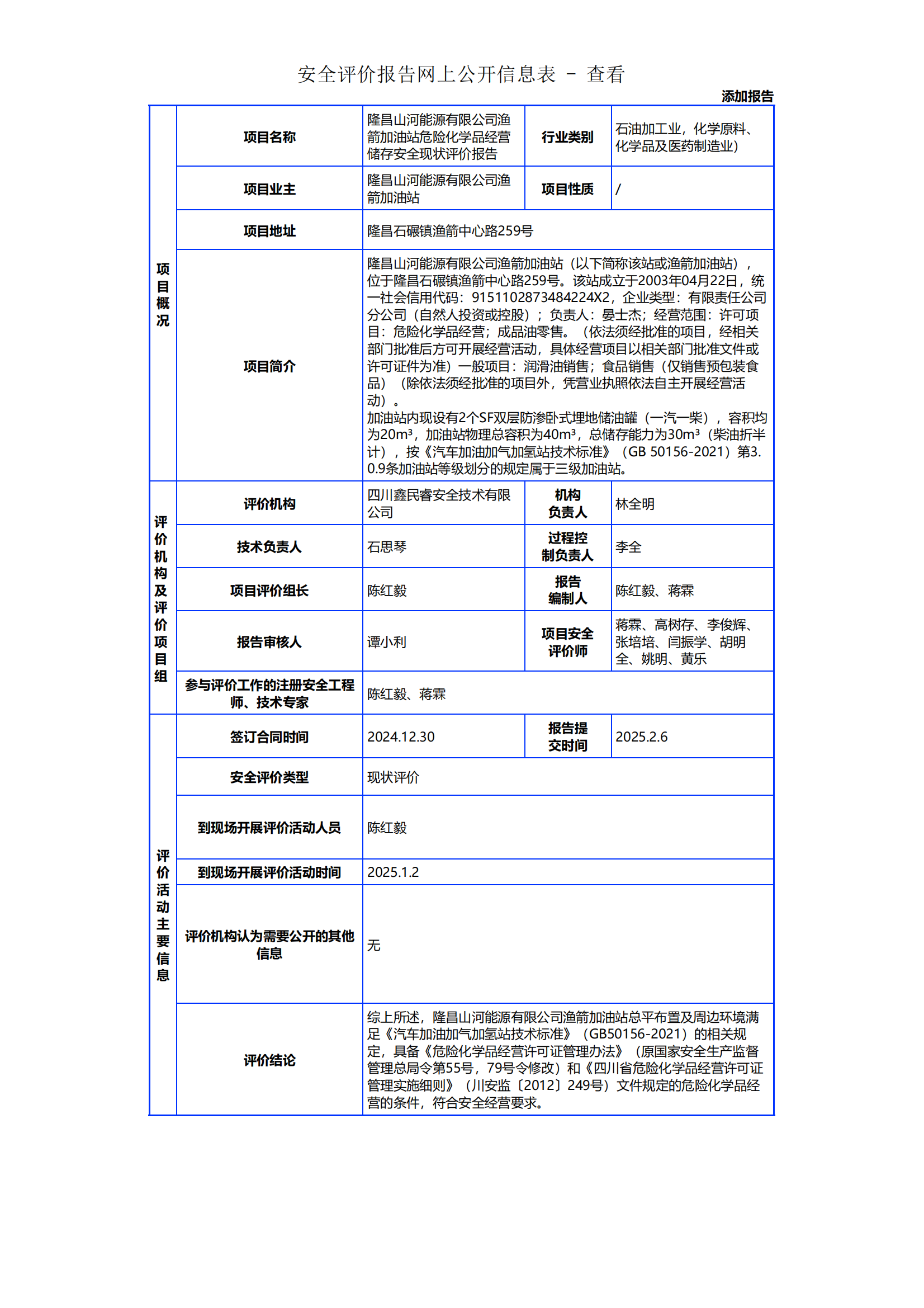 143隆昌山河能源有限公司渔箭加油站危险化学品经营储存安全现状评价报告