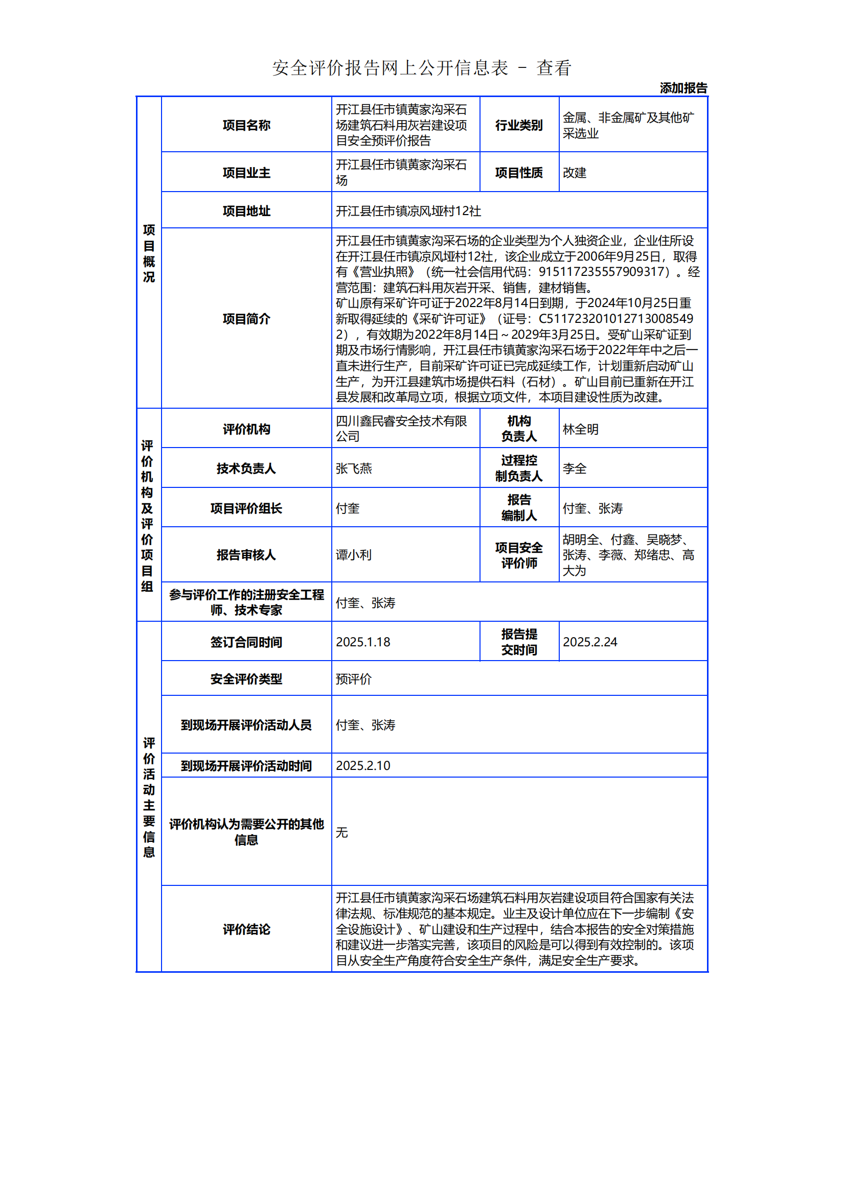 145开江县任市镇黄家沟采石场建筑石料用灰岩建设项目安全预评价