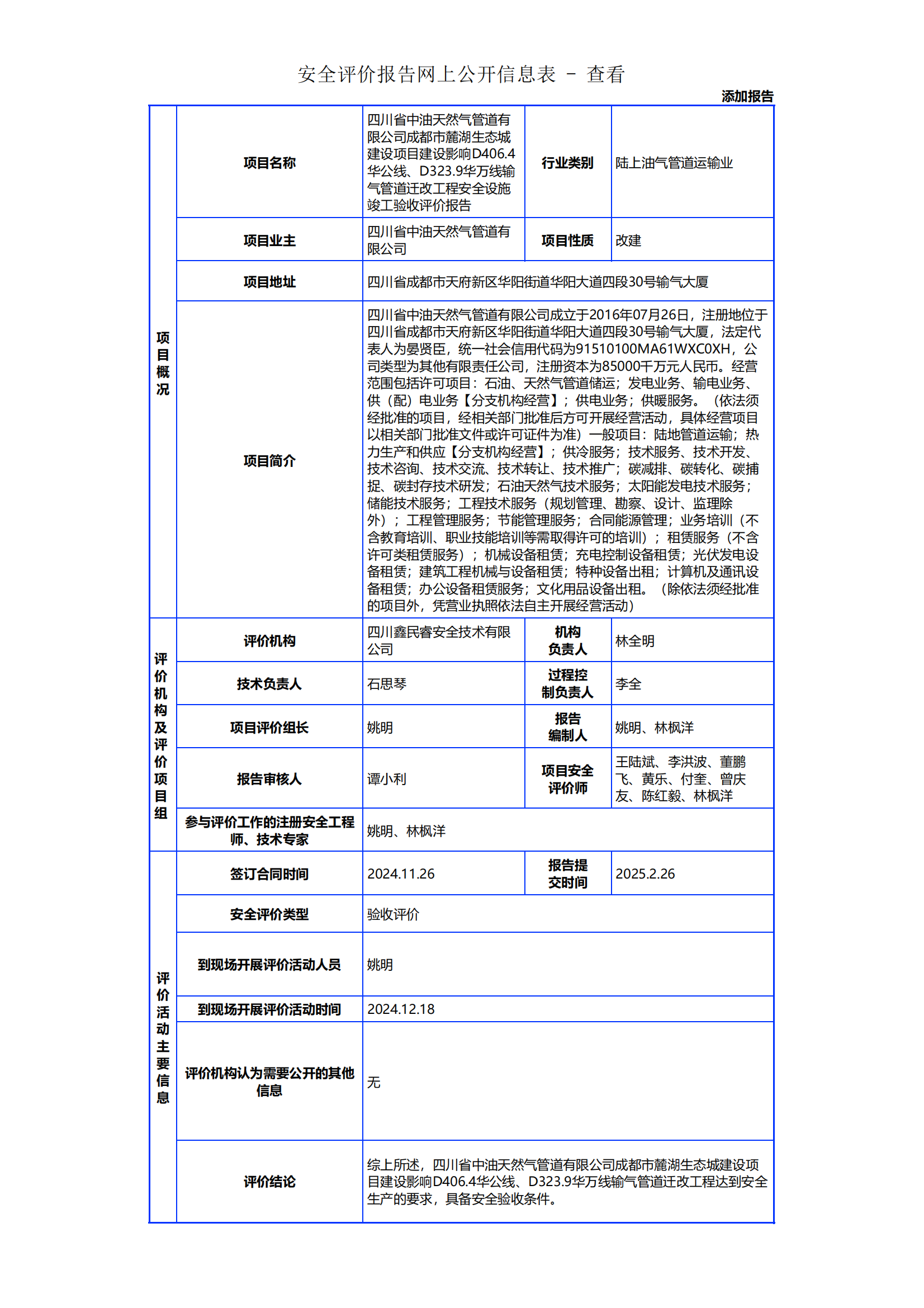 147四川省中油天然气管道有限公司成都市麓湖生态城建设项目建设影响D406.4华公线、D323.9华万线输气管道迁改工程安全设施竣工验收评价报告