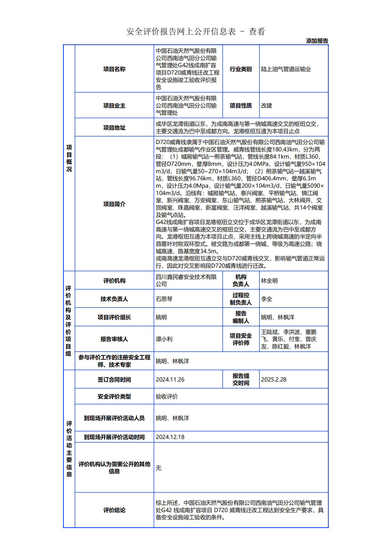 150中国石油天然气股份有限公司西南油气田分公司输气管理处G42线成南扩容项目D720威青线迁改工程安全设施竣工验收评价报告