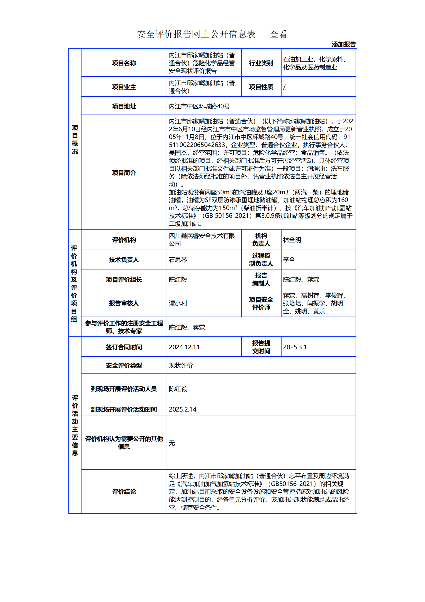 153内江市邱家嘴加油站(普通合伙)危险化学品经营安全现状评价报告