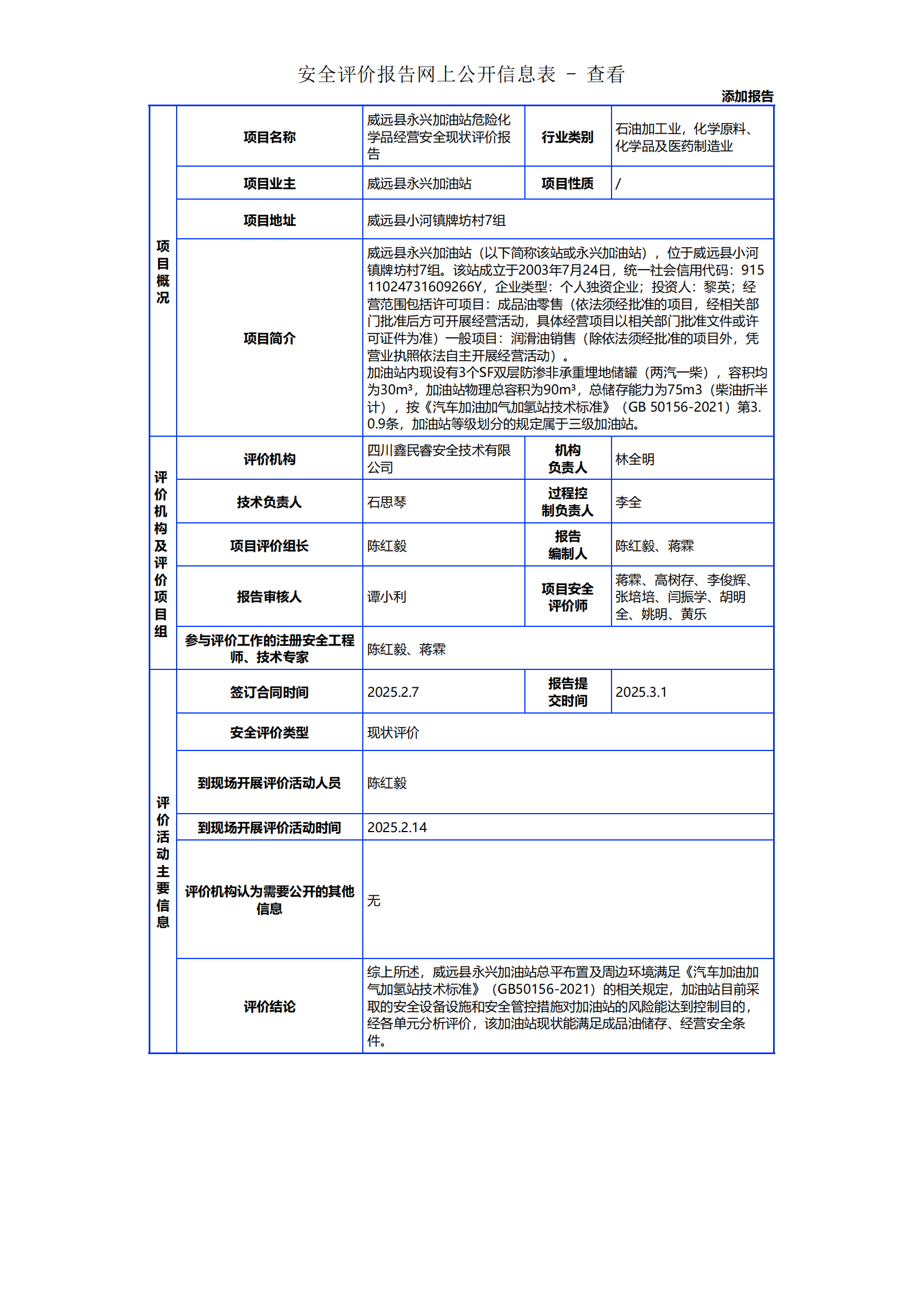 155威远县永兴加油站危险化学品经营安全现状评价报告