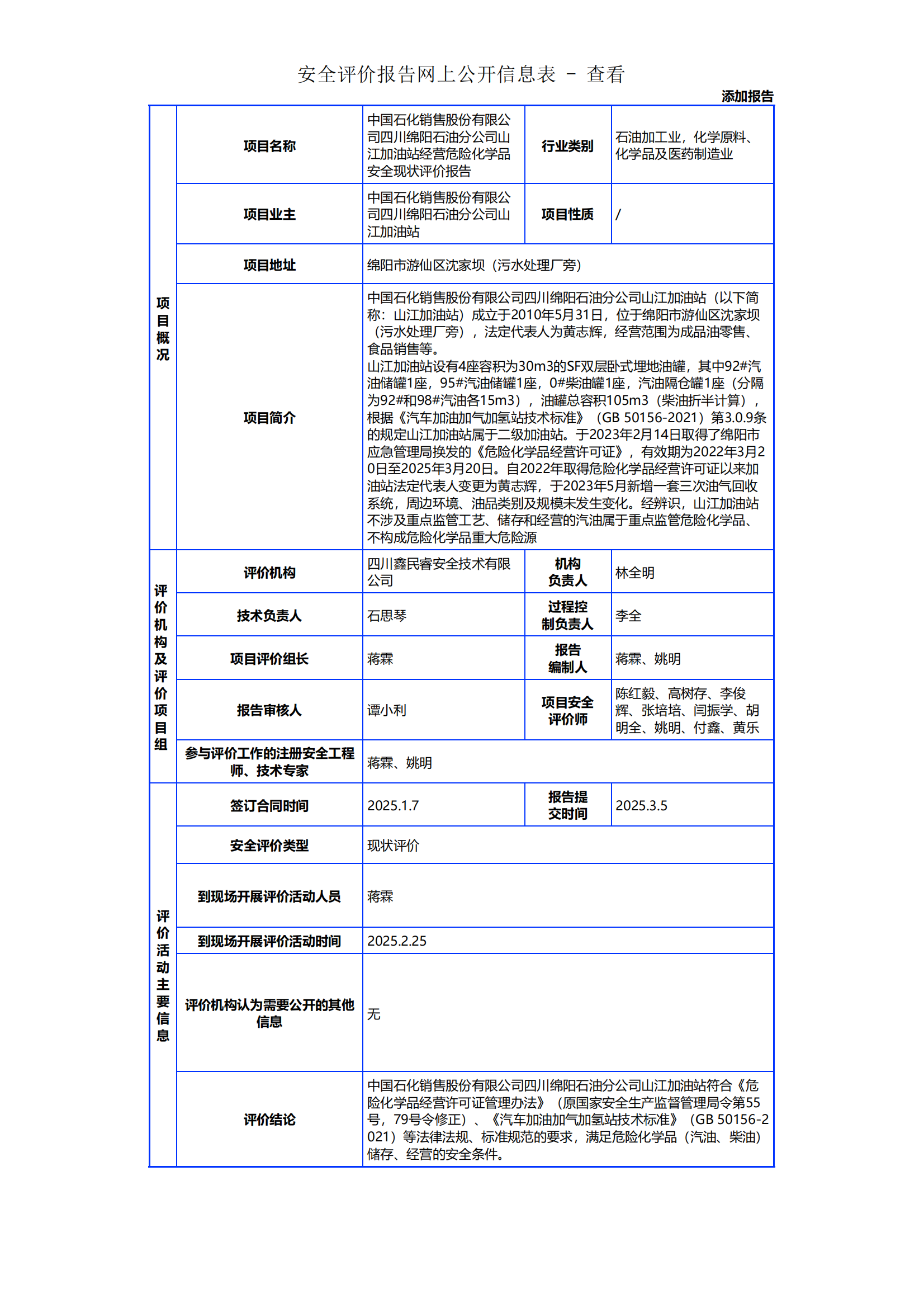 157中国石化销售股份有限公司四川绵阳石油分公司山江加油站经营危险化学品安全现状评价报告