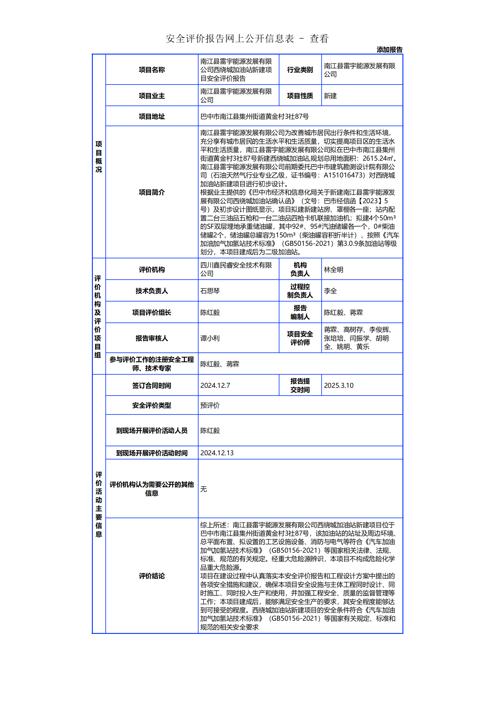 163南江县雷宇能源发展有限公司西绕城加油站新建项目安全评价报告