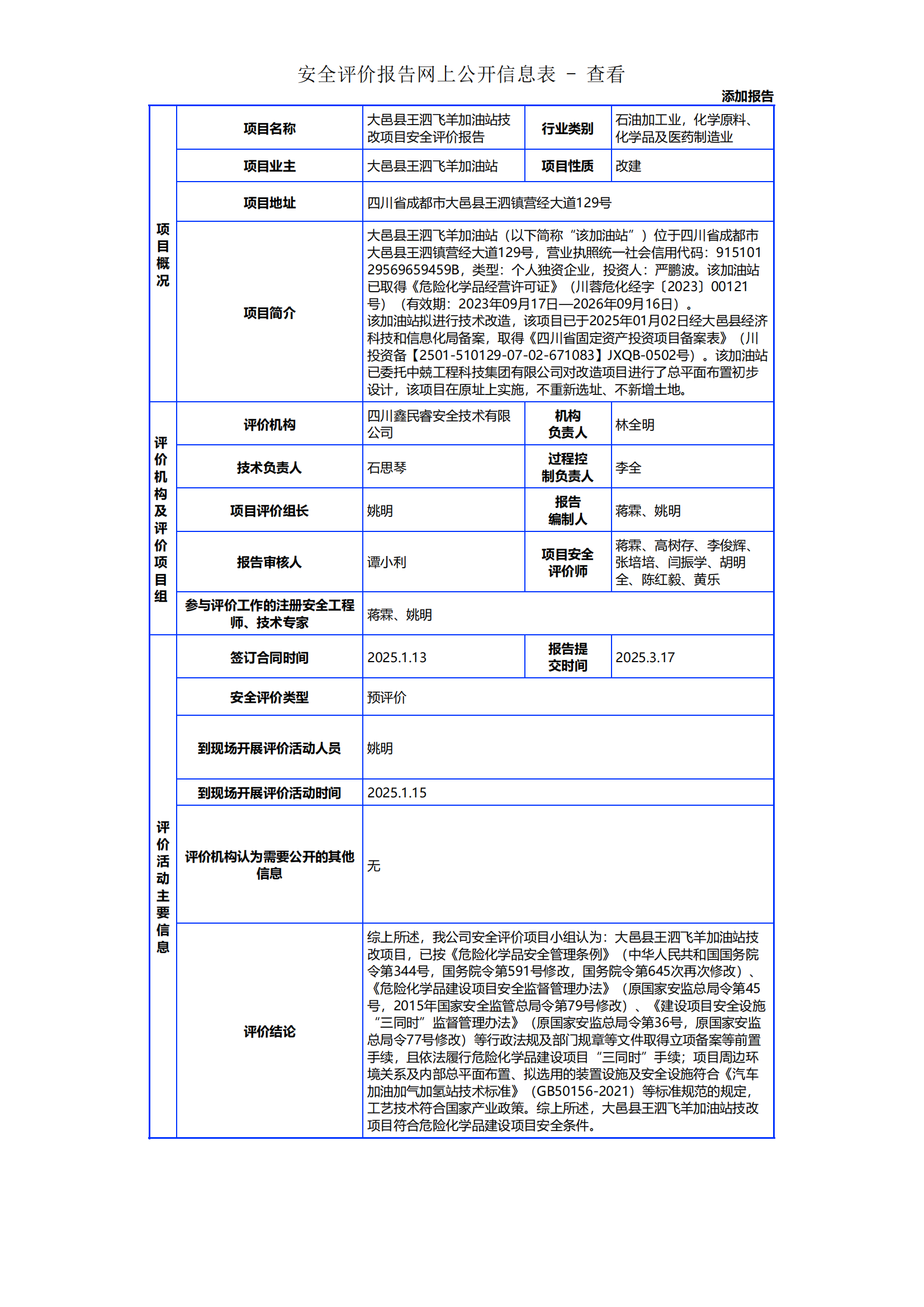 167大邑县王泗飞羊加油站技改项目安全评价报告