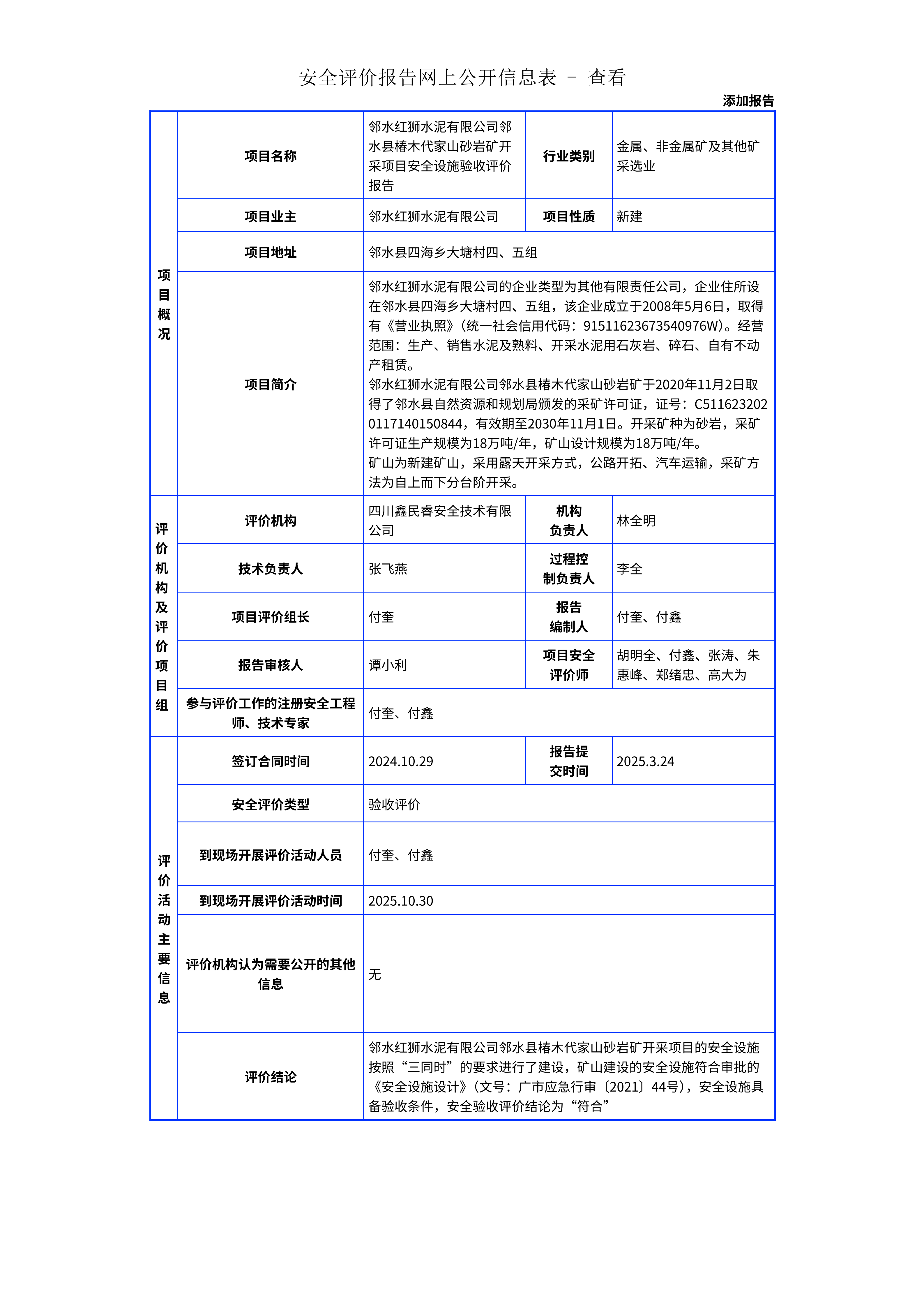 174邻水红狮水泥有限公司邻水县椿木代家山砂岩矿开采项目安全设施验收评价报告