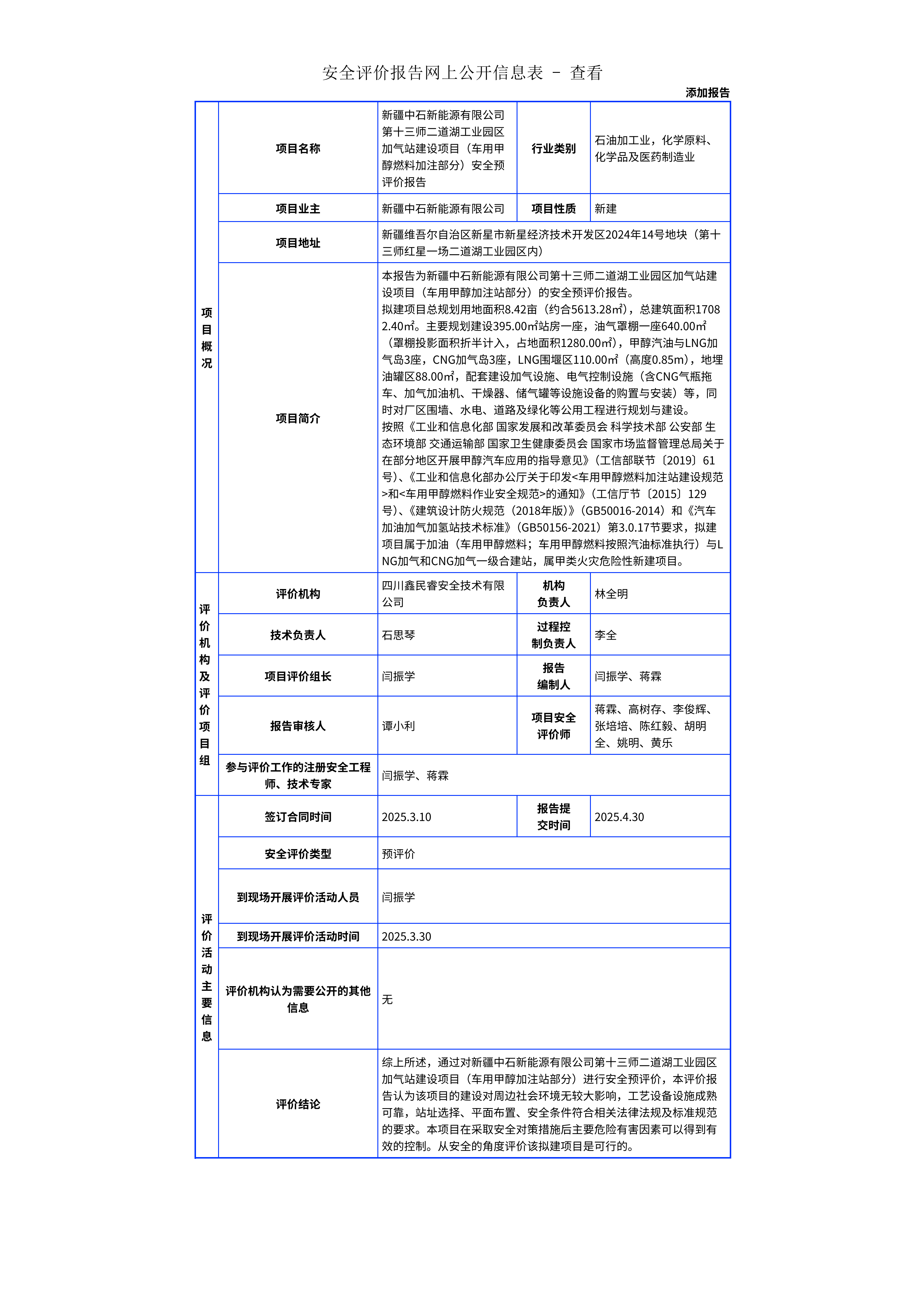 198新疆中石新能源有限公司第十三师二道湖工业园区加气站建设项目(车用甲醇燃料加注部分)安全预评价报告