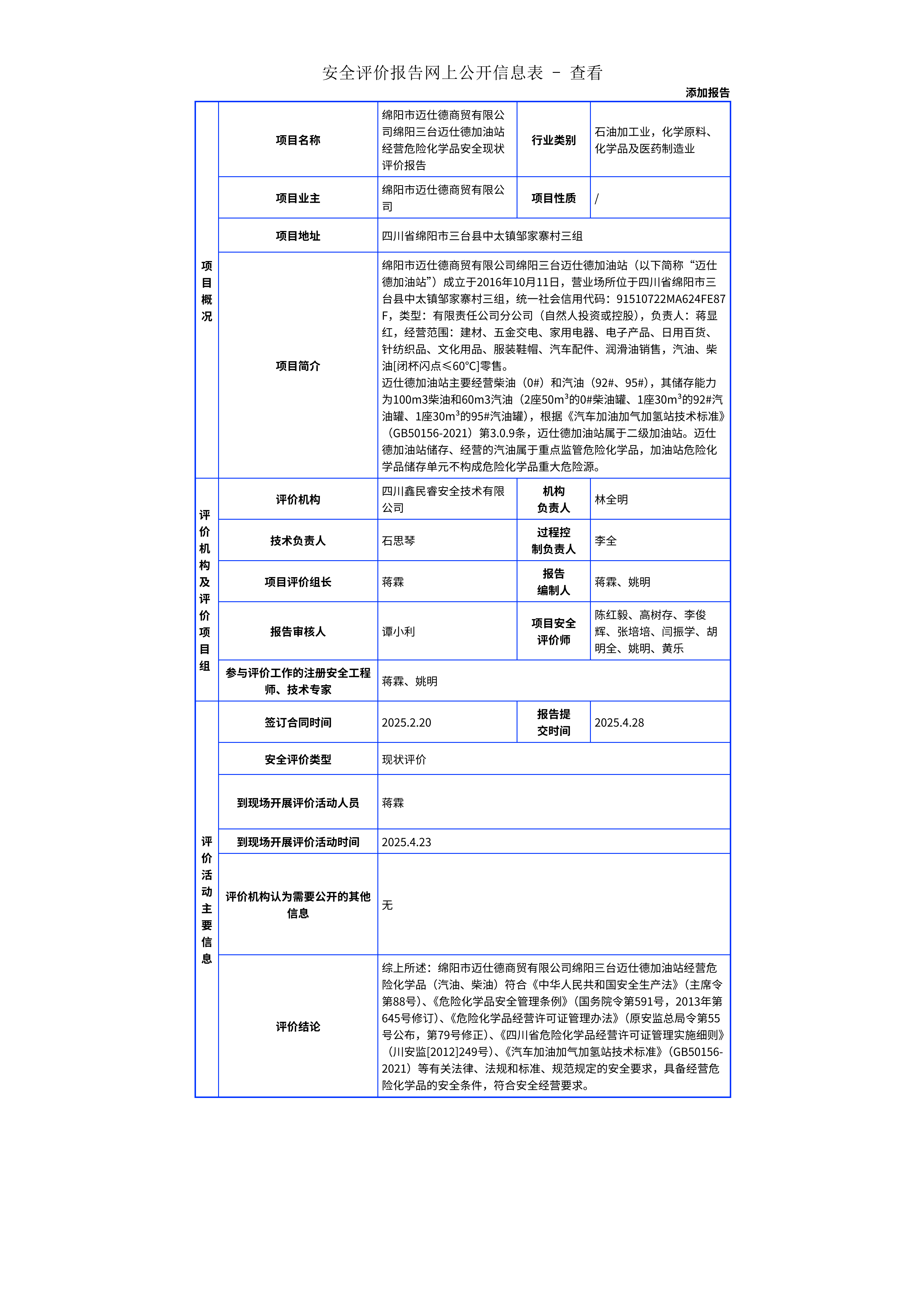 200绵阳市迈仕德商贸有限公司绵阳三台迈仕德加油站经营危险化学品安全现状评价报告