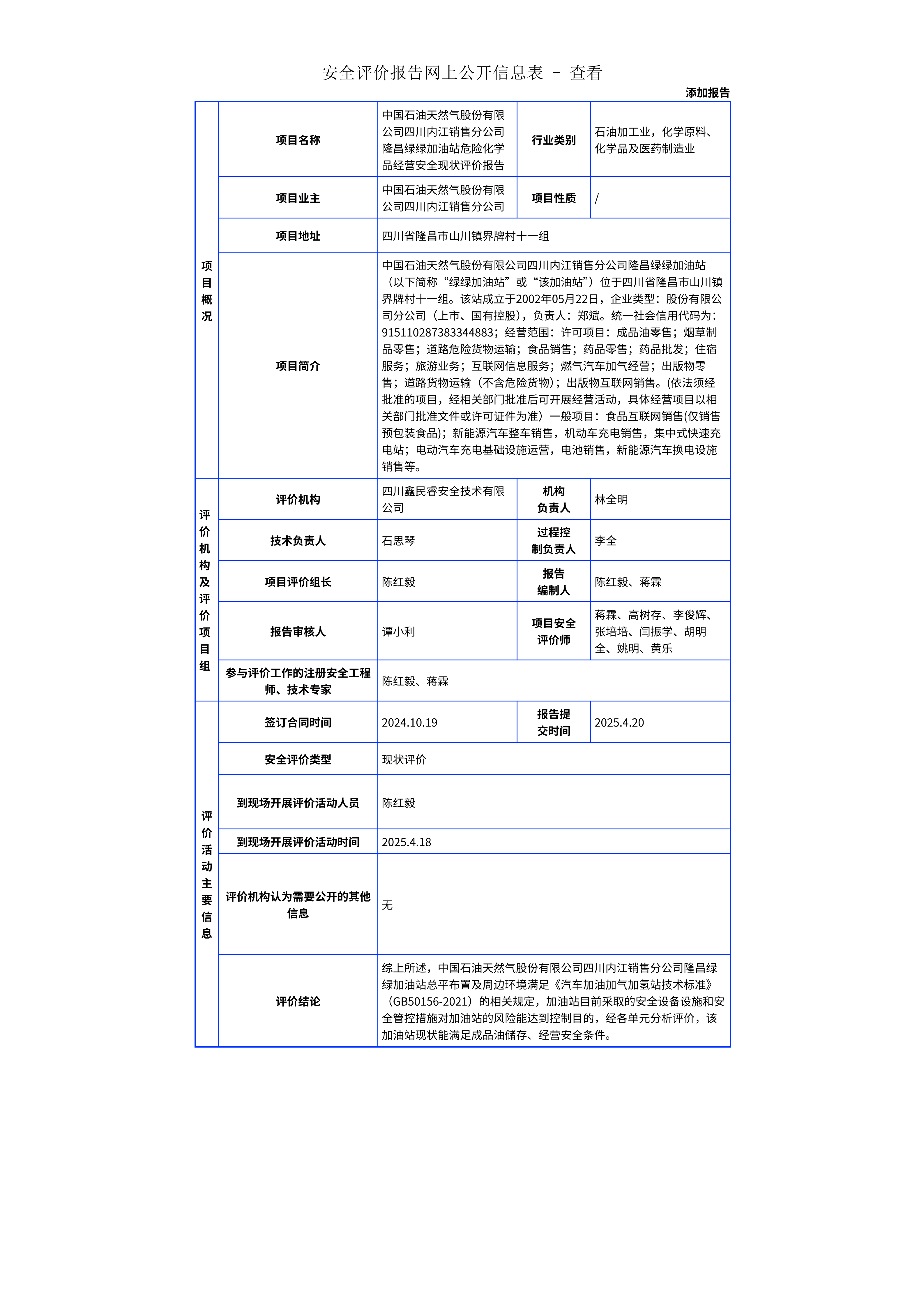 201中国石油天然气股份有限公司四川内江销售分公司隆昌绿绿加油站危险化学品经营安全现状评价报告