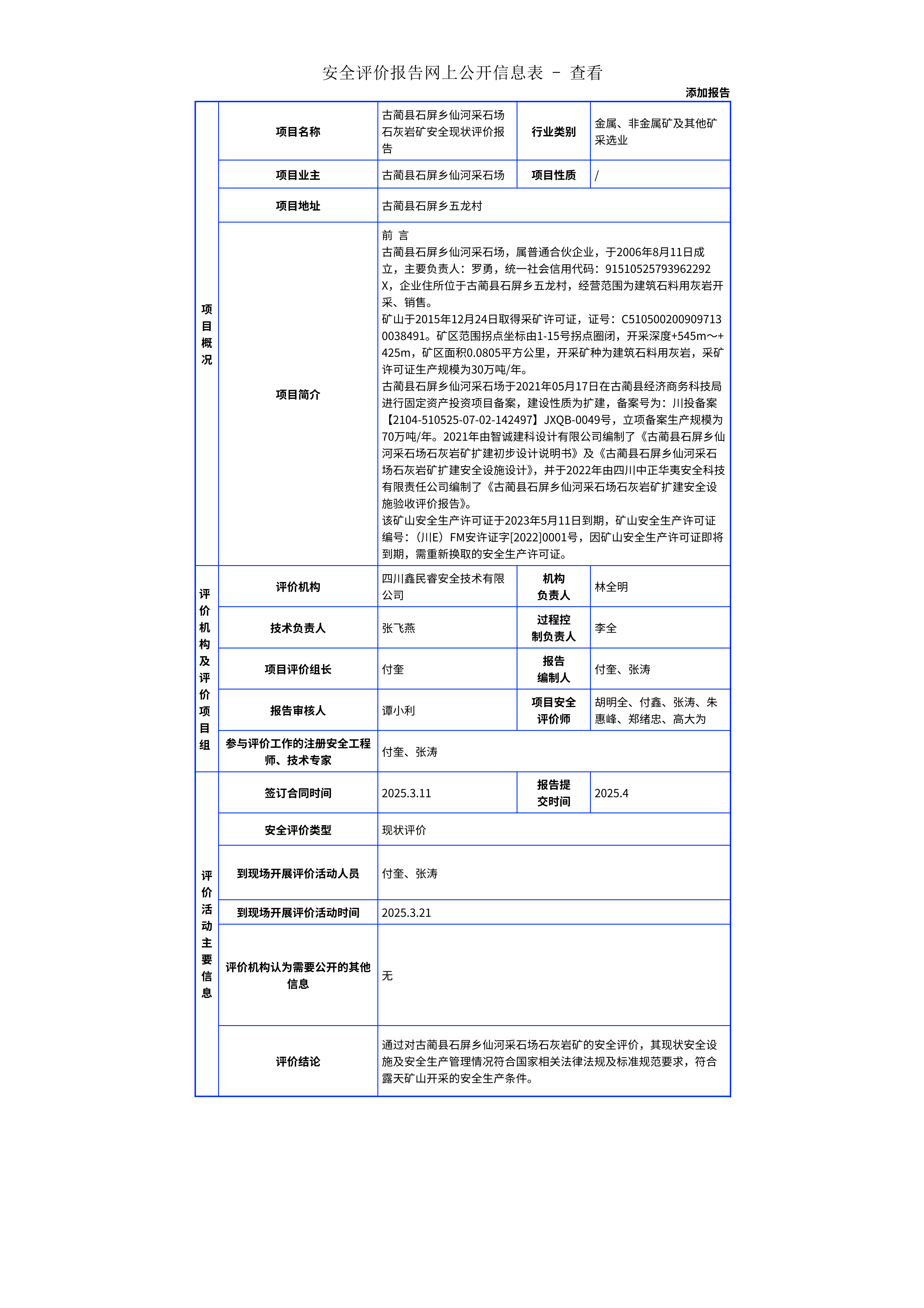 204古蔺县石屏乡仙河采石场石灰岩矿安全现状评价报告