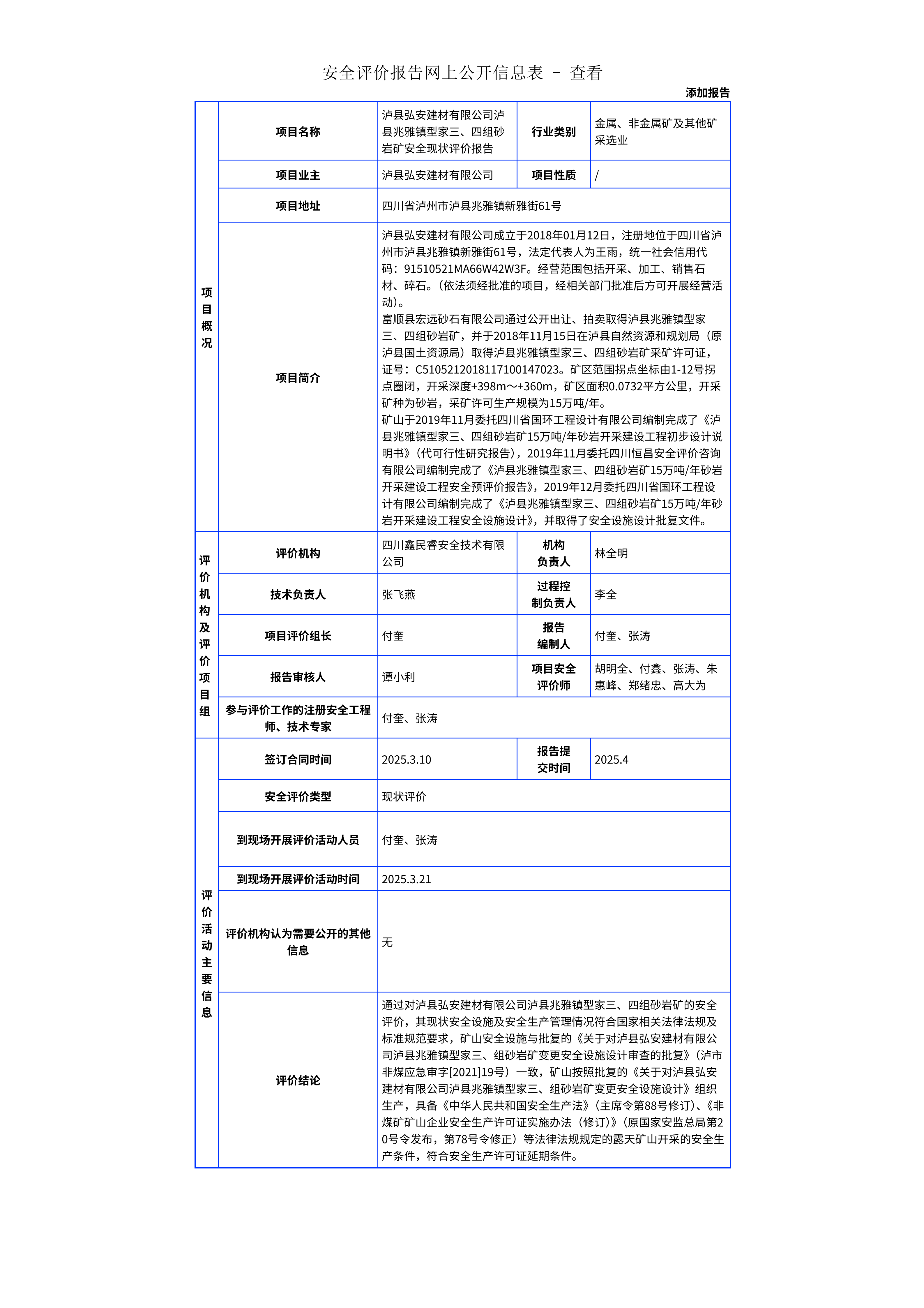 205通过对泸县弘安建材有限公司泸县兆雅镇型家三、四组砂岩矿的安全评价,其现状安全设施及安全生产管理情况符合国家相关法律法规及标准规范要求,矿山安全设施与批复的《关于对泸县弘安建材有限公司泸县兆雅镇型家三、组砂岩矿变更安全设施设计审查的批复》(泸市非煤应急审字[2021]19号)一致,矿山按照批复的