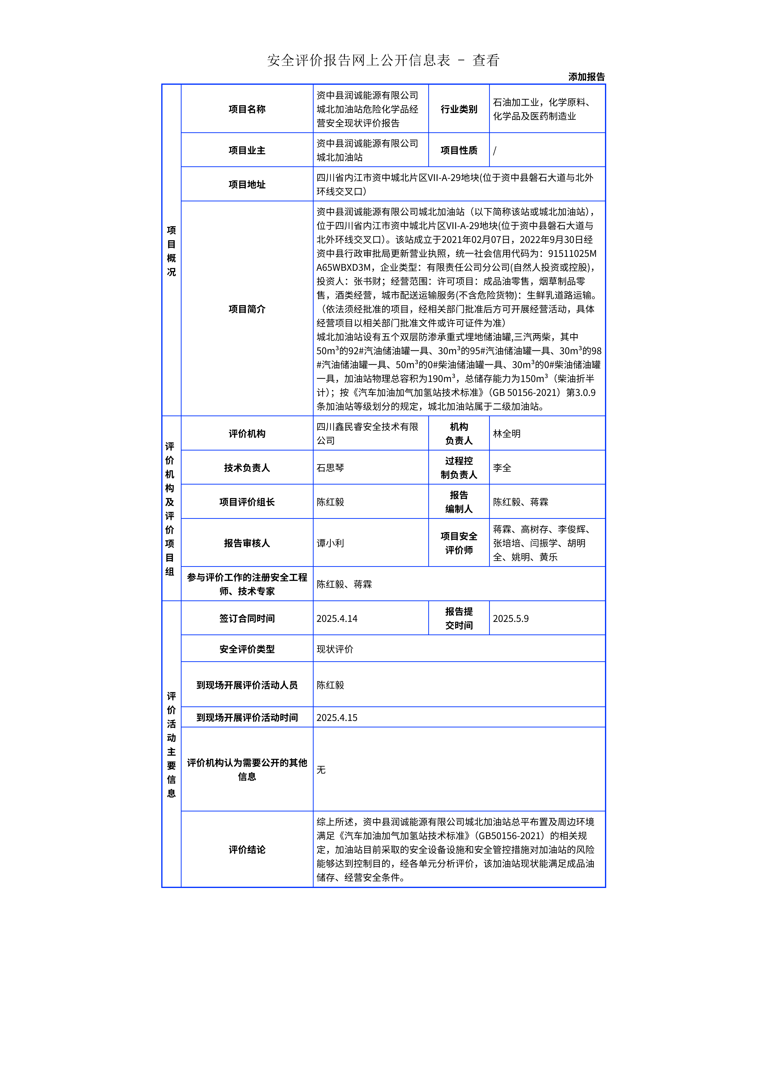 212资中县润诚能源有限公司城北加油站危险化学品经营安全现状评价报告