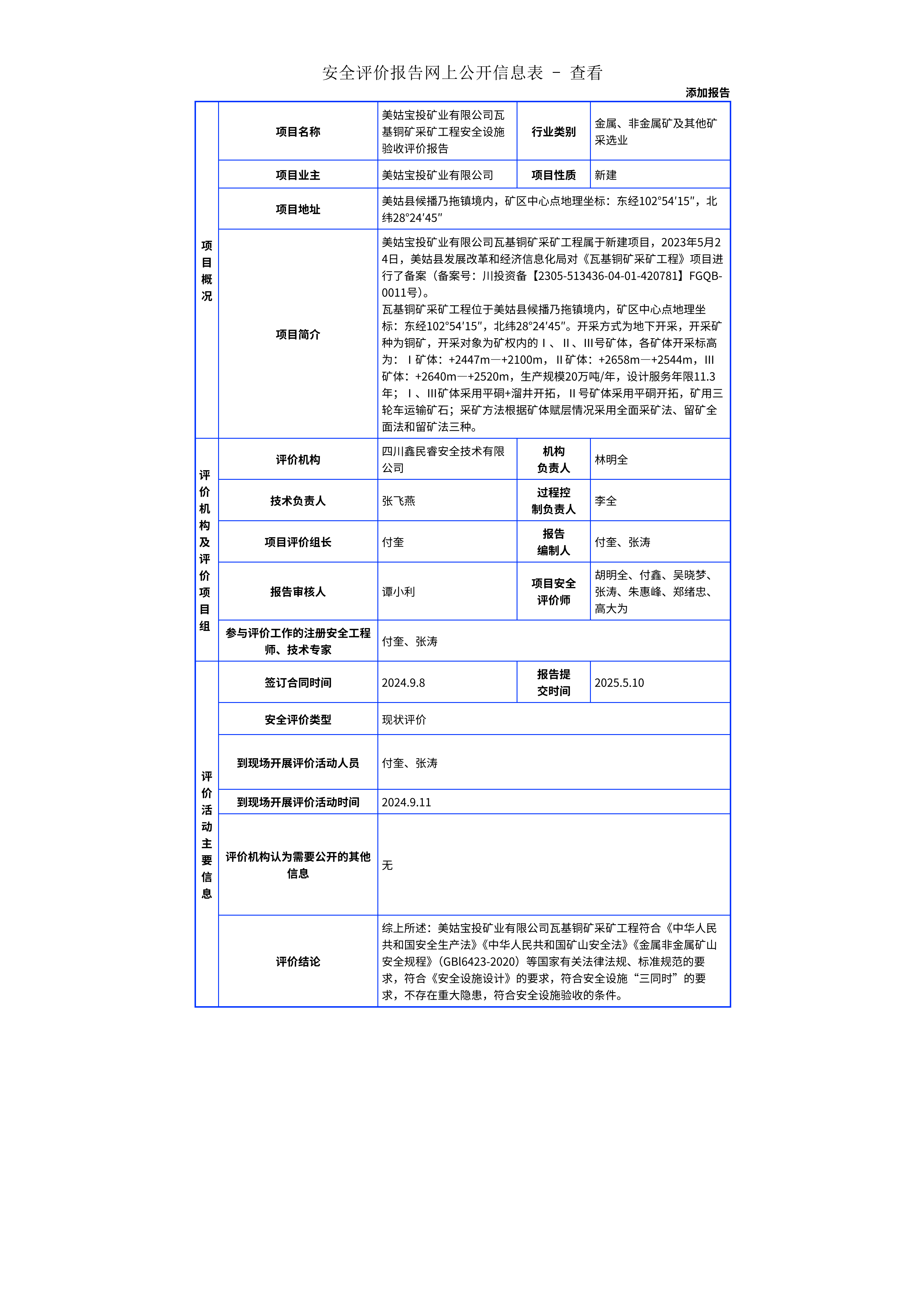 213美姑宝投矿业有限公司瓦基铜矿采矿工程安全设施验收评价报告