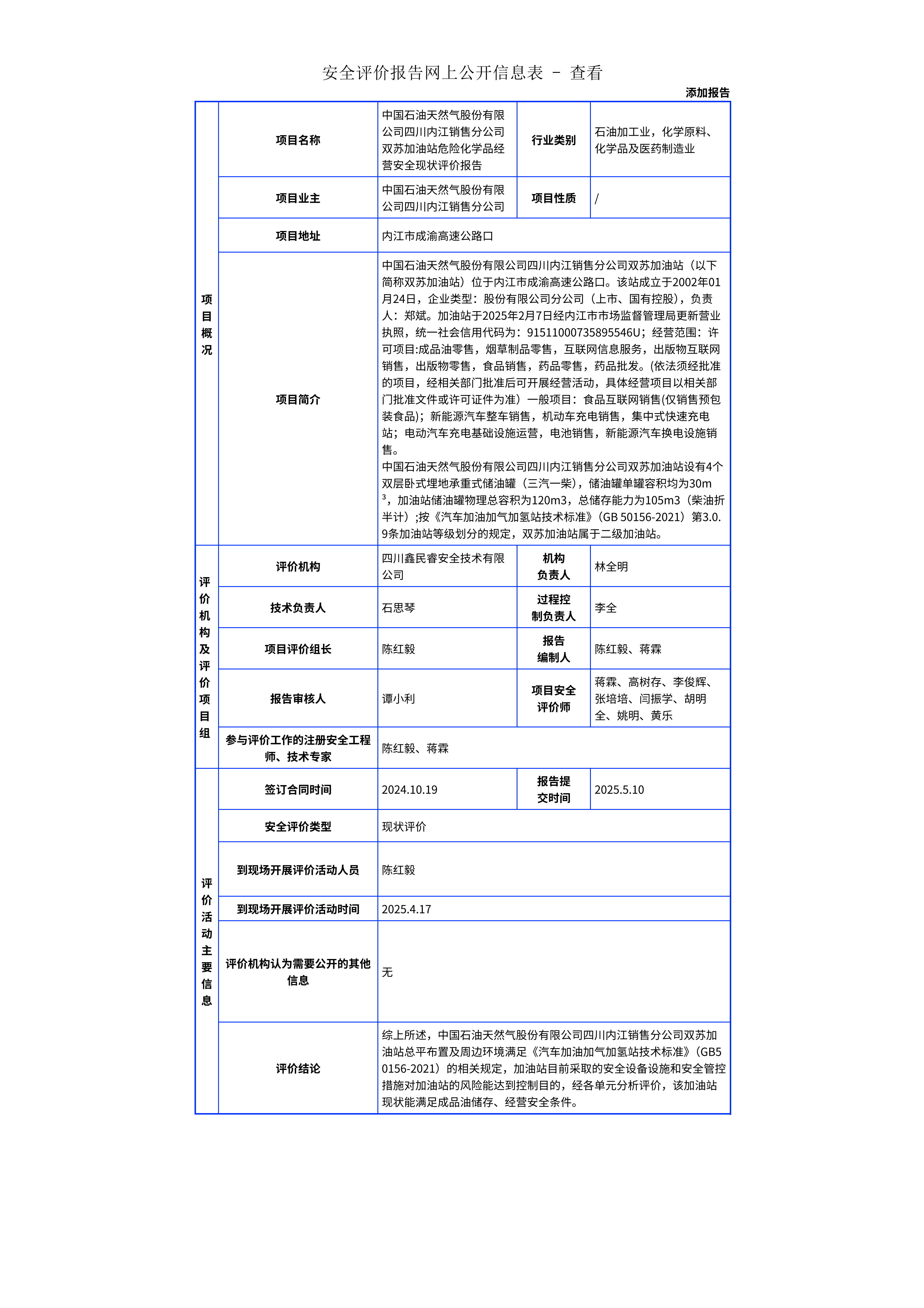 214中国石油天然气股份有限公司四川内江销售分公司双苏加油站危险化学品经营安全现状评价报告