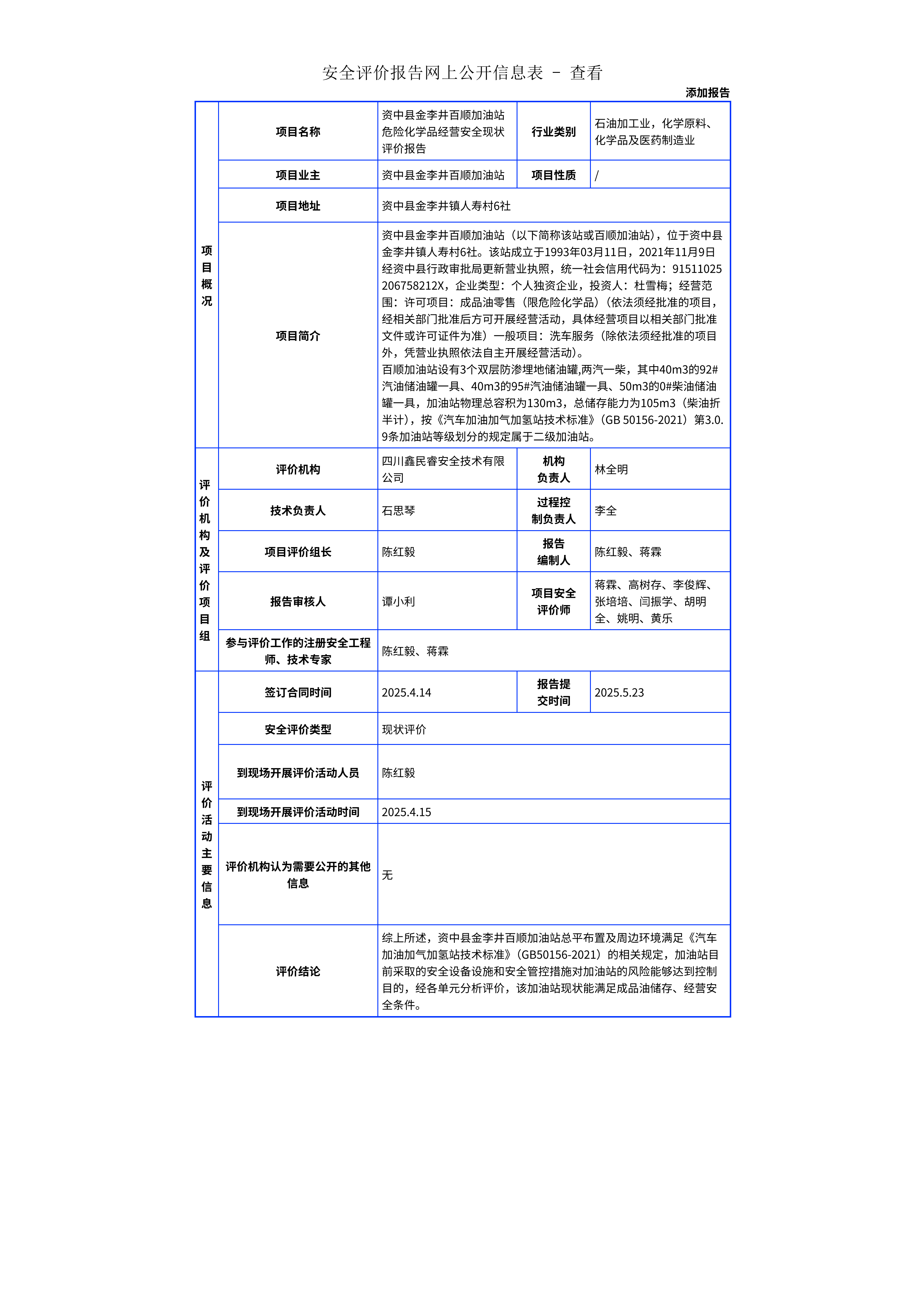 218资中县金李井百顺加油站危险化学品经营安全现状评价报告