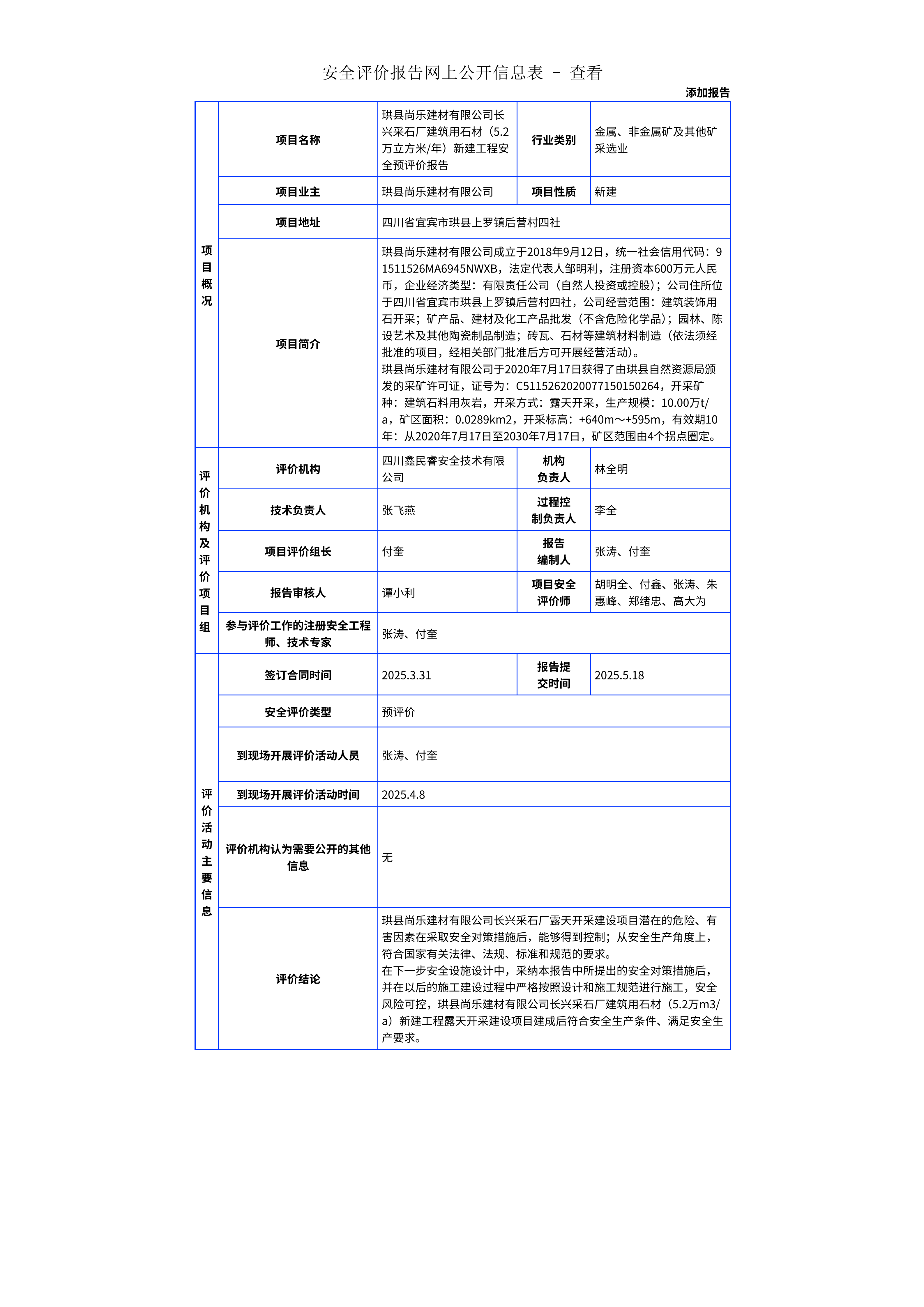 224珙县尚乐建材有限公司长兴采石厂建筑用石材(5.2万立方米年)新建工程安全预评价报告