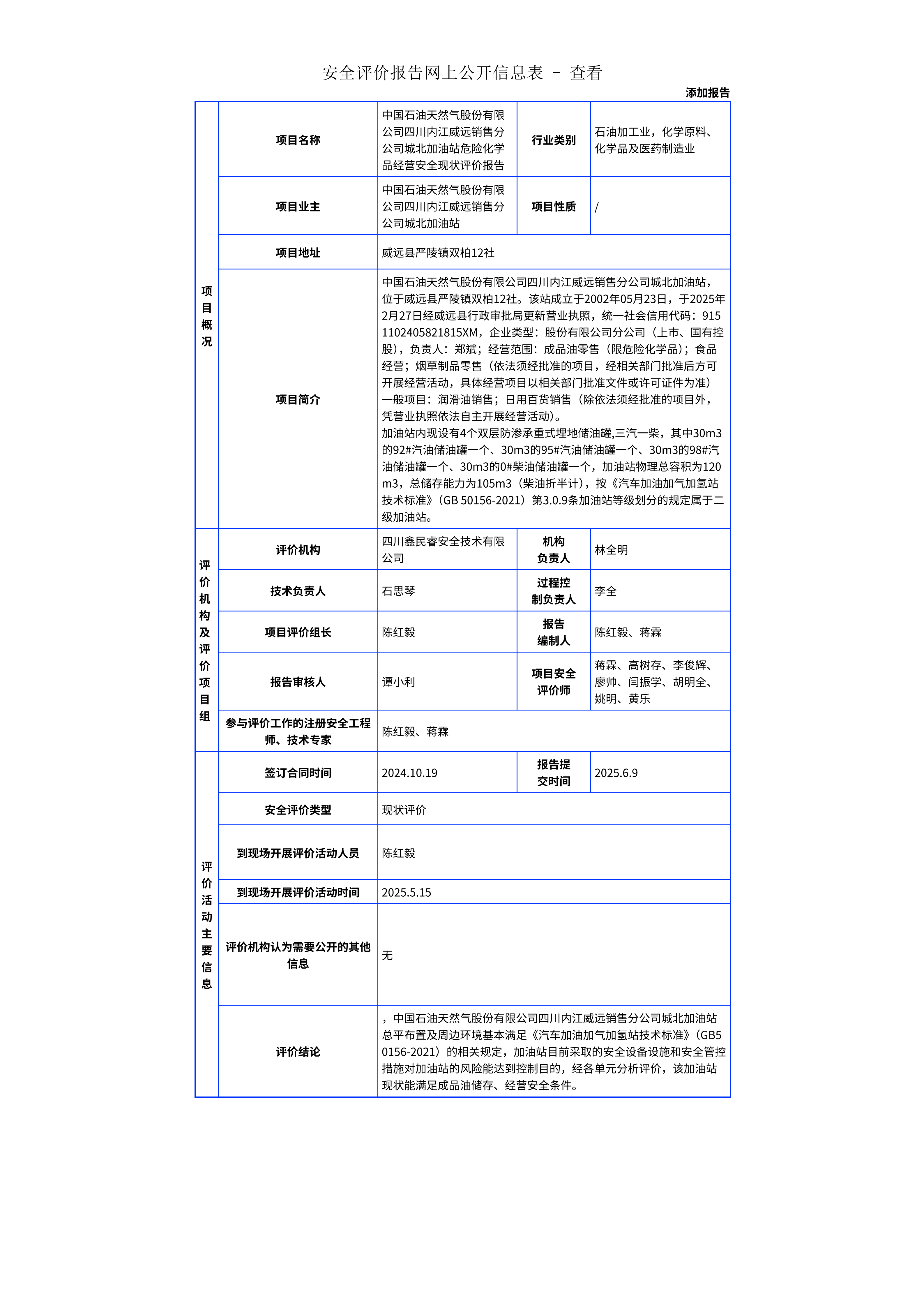 227中国石油天然气股份有限公司四川内江威远销售分公司城北加油站危险化学品经营安全现状评价报告