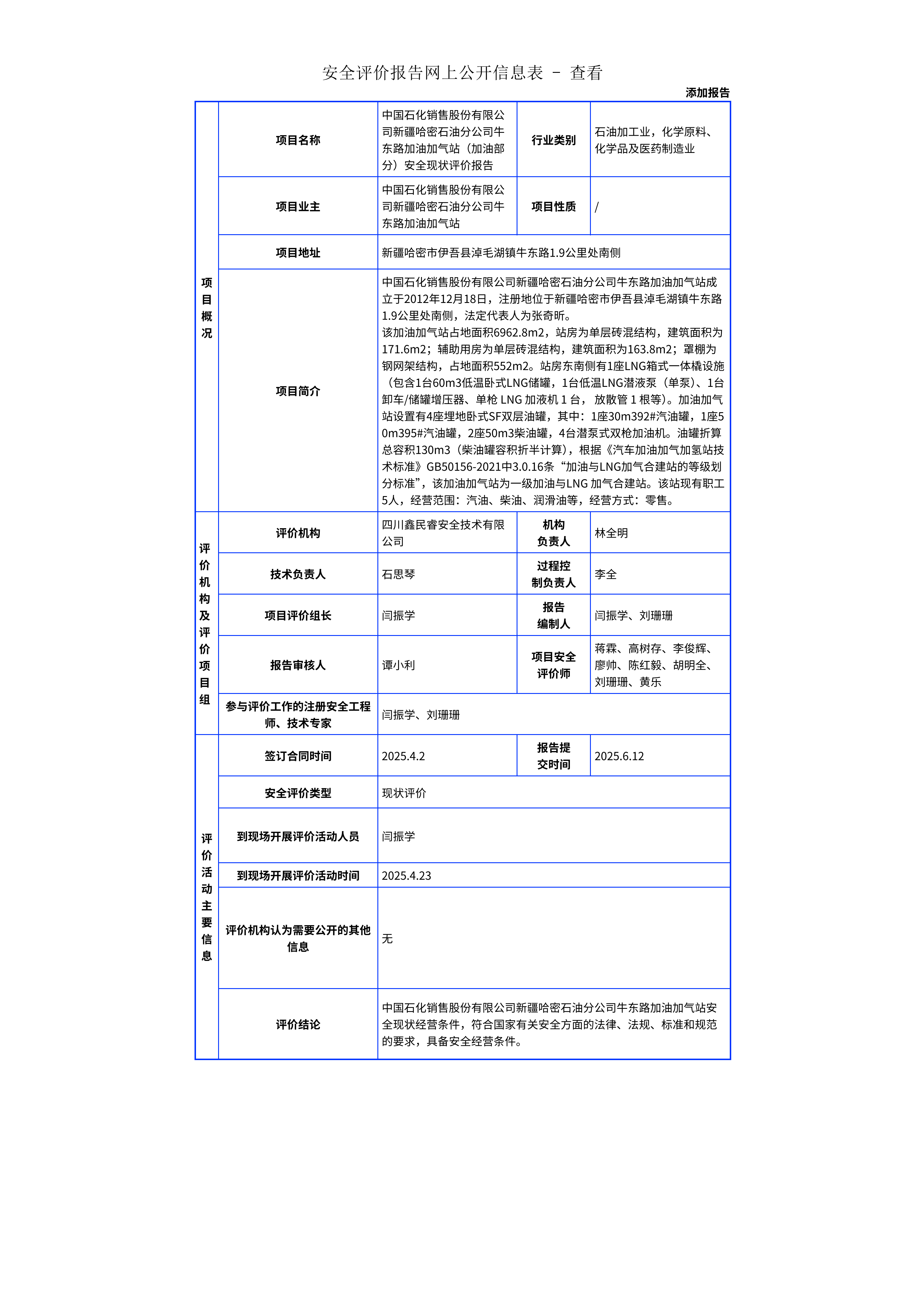 228中国石化销售股份有限公司新疆哈密石油分公司牛东路加油加气站(加油部分)安全现状评价报告