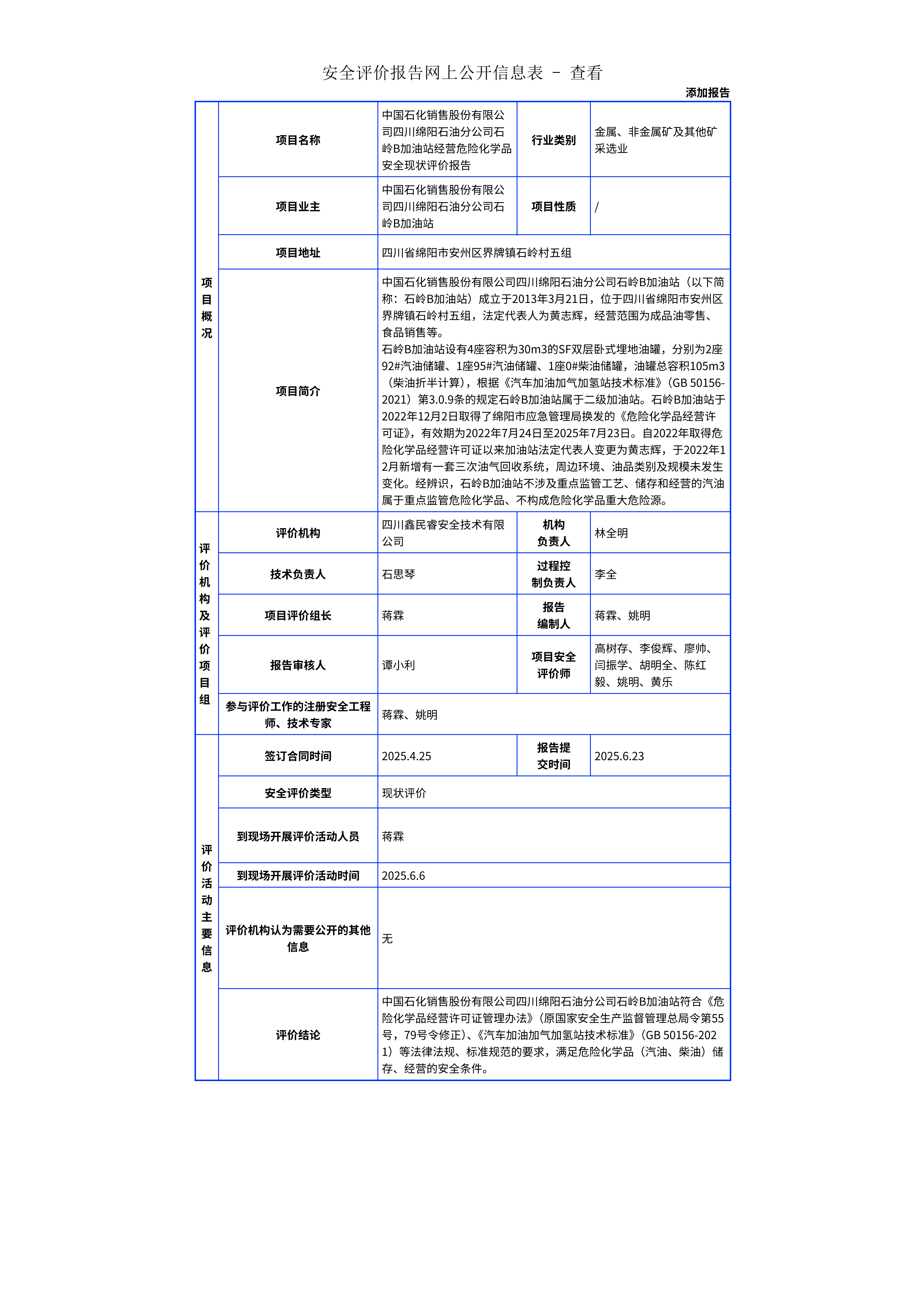 235中国石化销售股份有限公司四川绵阳石油分公司石岭B加油站经营危险化学品安全现状评价报告