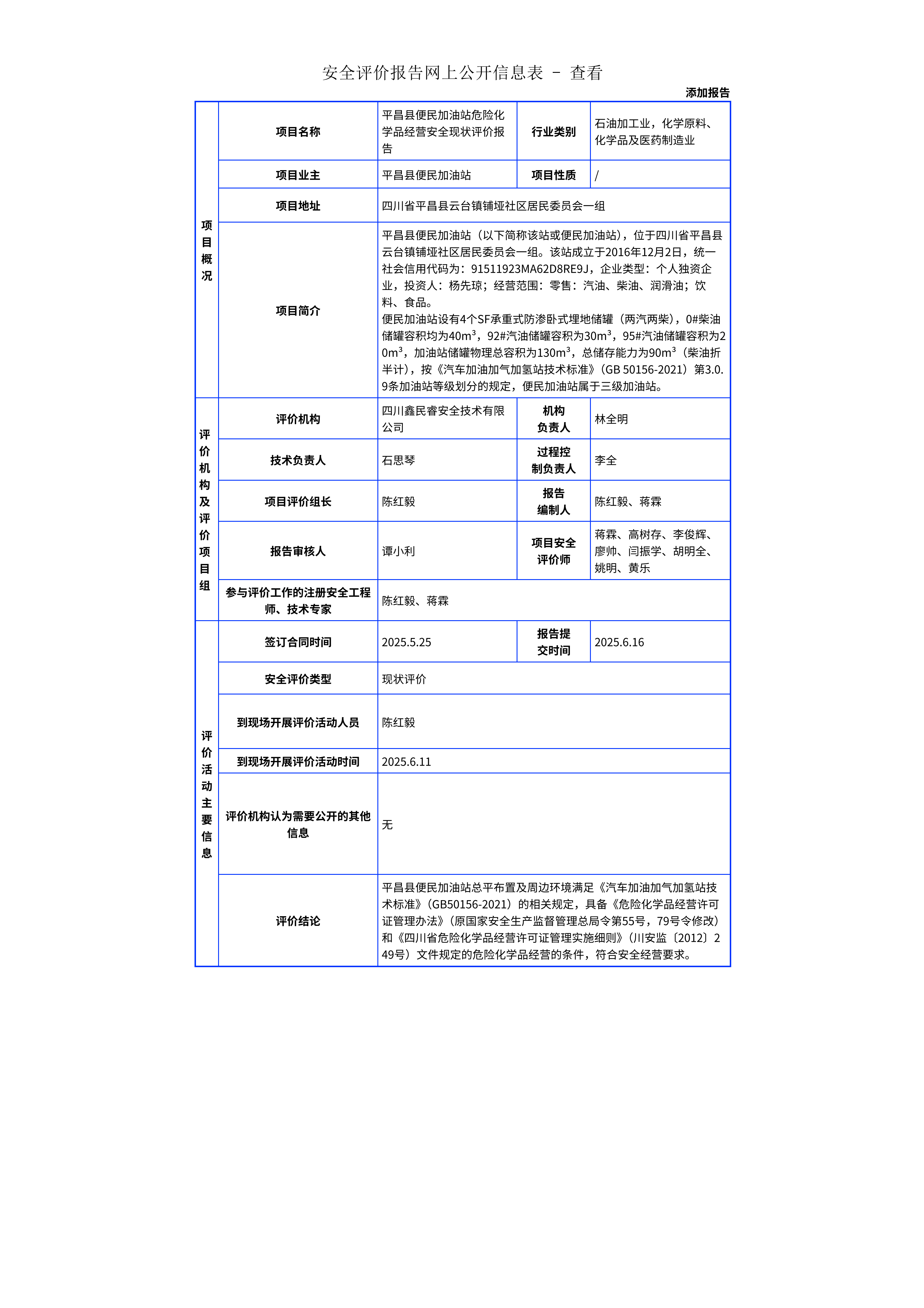 237平昌县便民加油站危险化学品经营安全现状评价报告