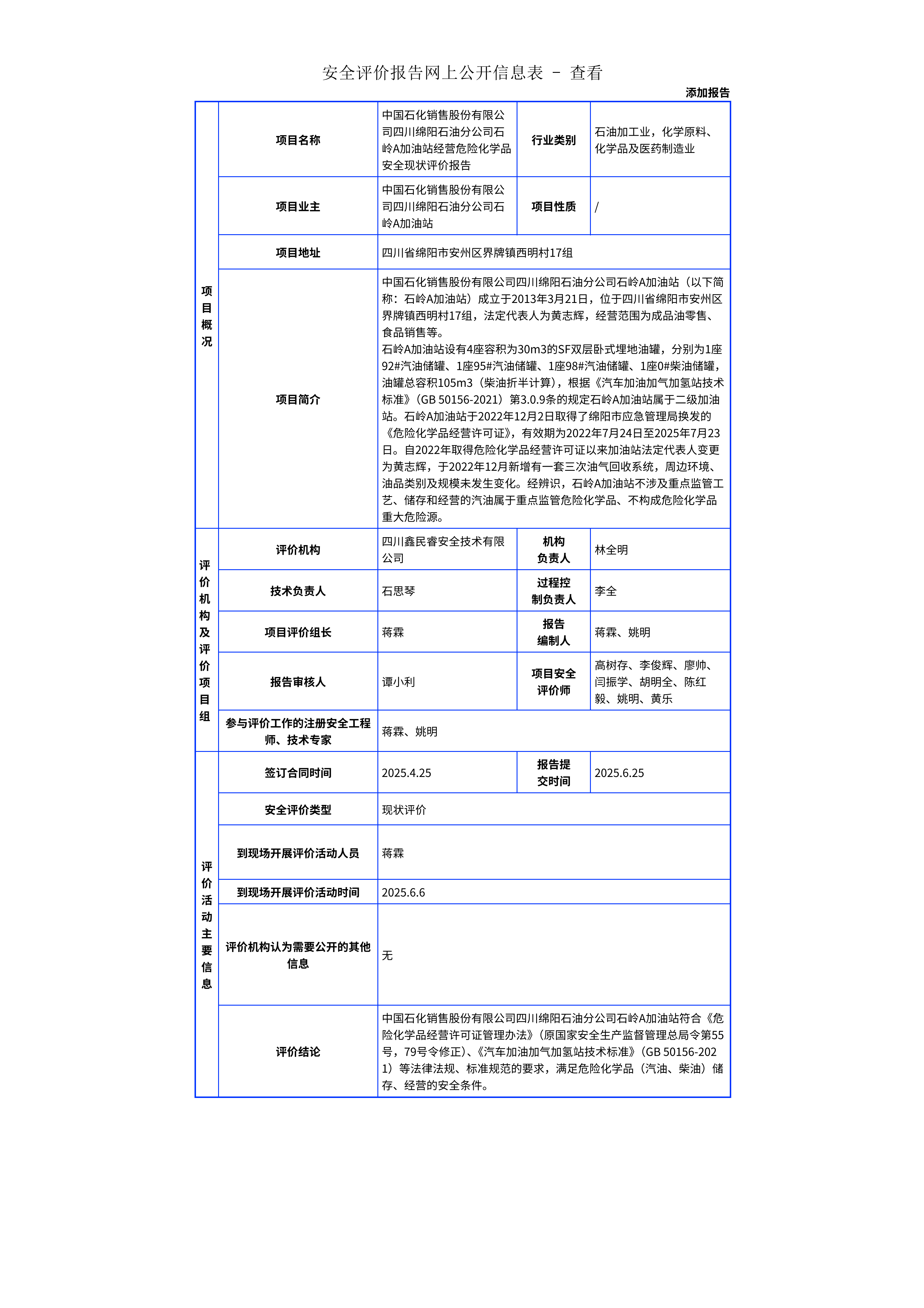 241中国石化销售股份有限公司四川绵阳石油分公司石岭A加油站经营危险化学品安全现状评价报告