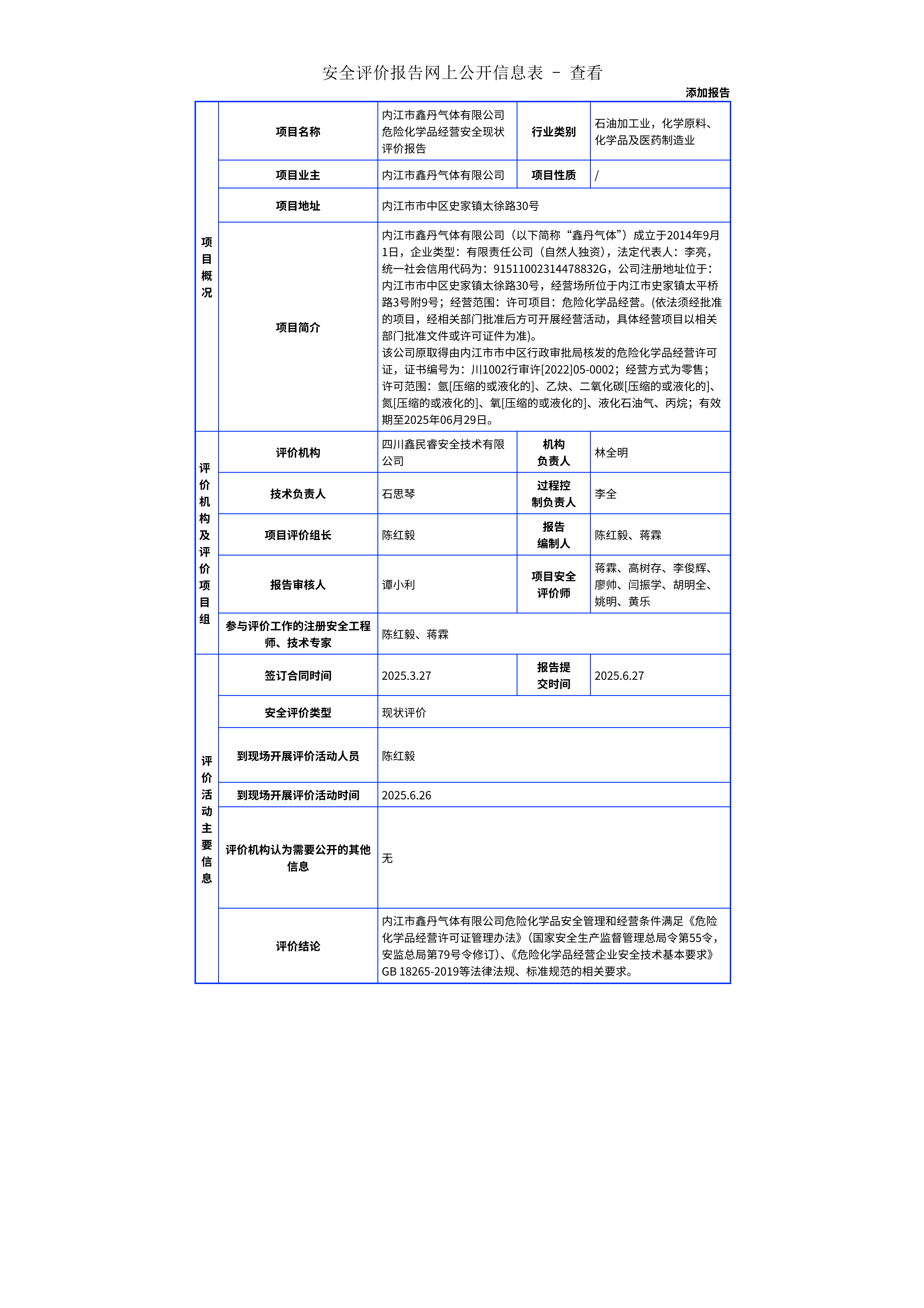 246内江市鑫丹气体有限公司危险化学品经营安全现状评价报告