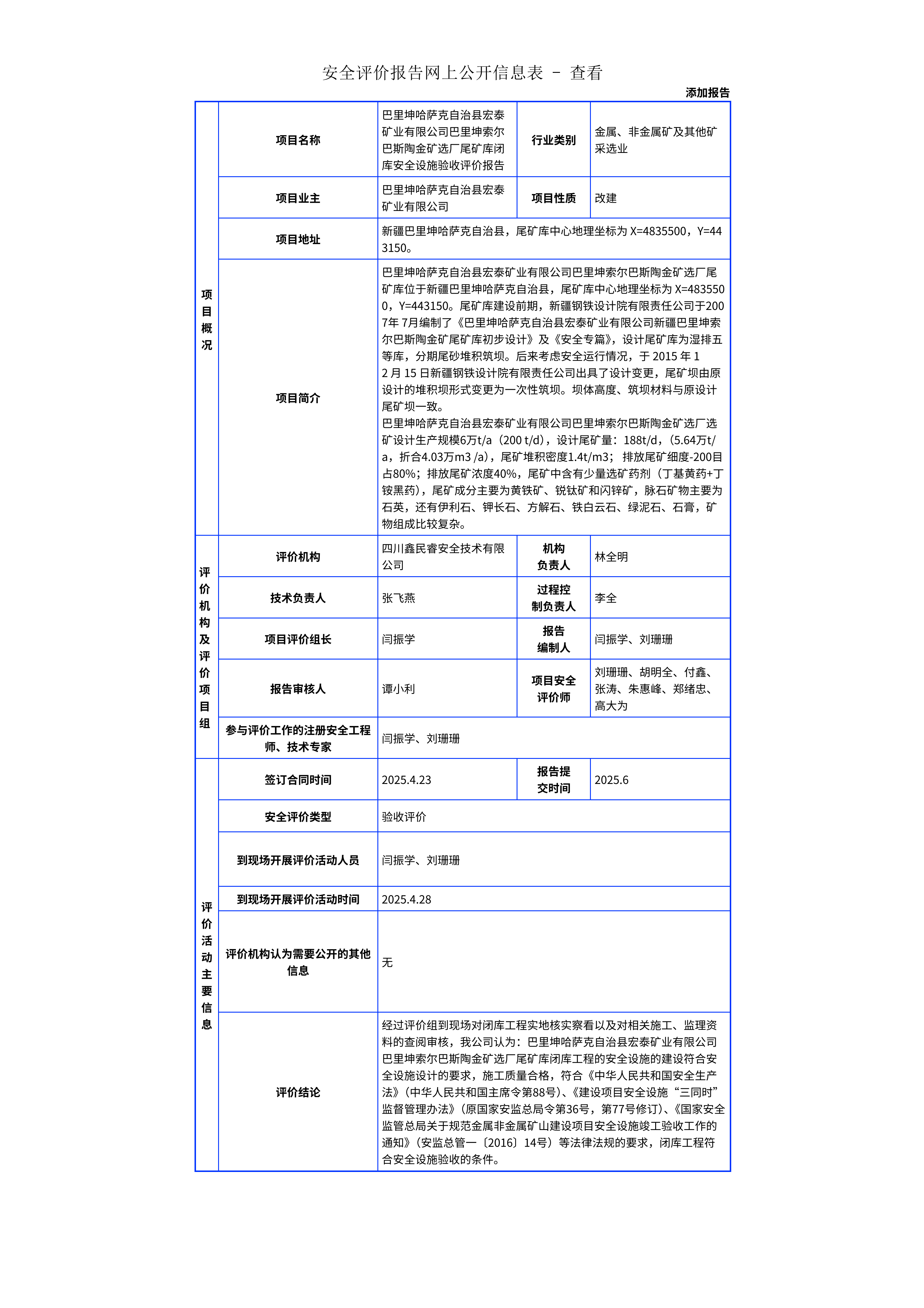 248巴里坤哈萨克自治县宏泰矿业有限公司巴里坤索尔巴斯陶金矿选厂尾矿库闭库安全设施验收评价报告
