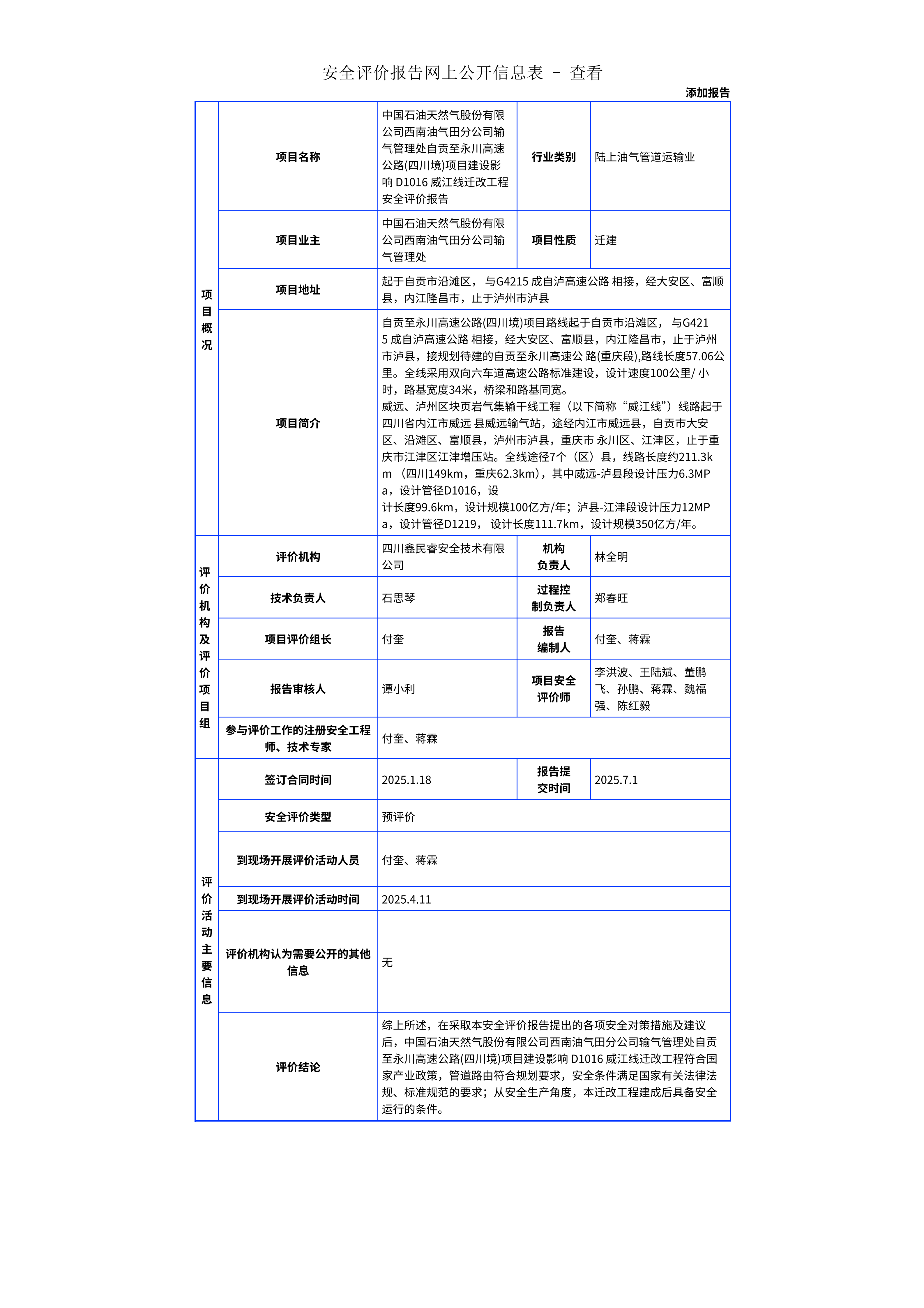 250中国石油天然气股份有限公司西南油气田分公司输气管理处自贡至永川高速公路(四川境)项目建设影响 D1016 威江线迁改工程安全评价报告