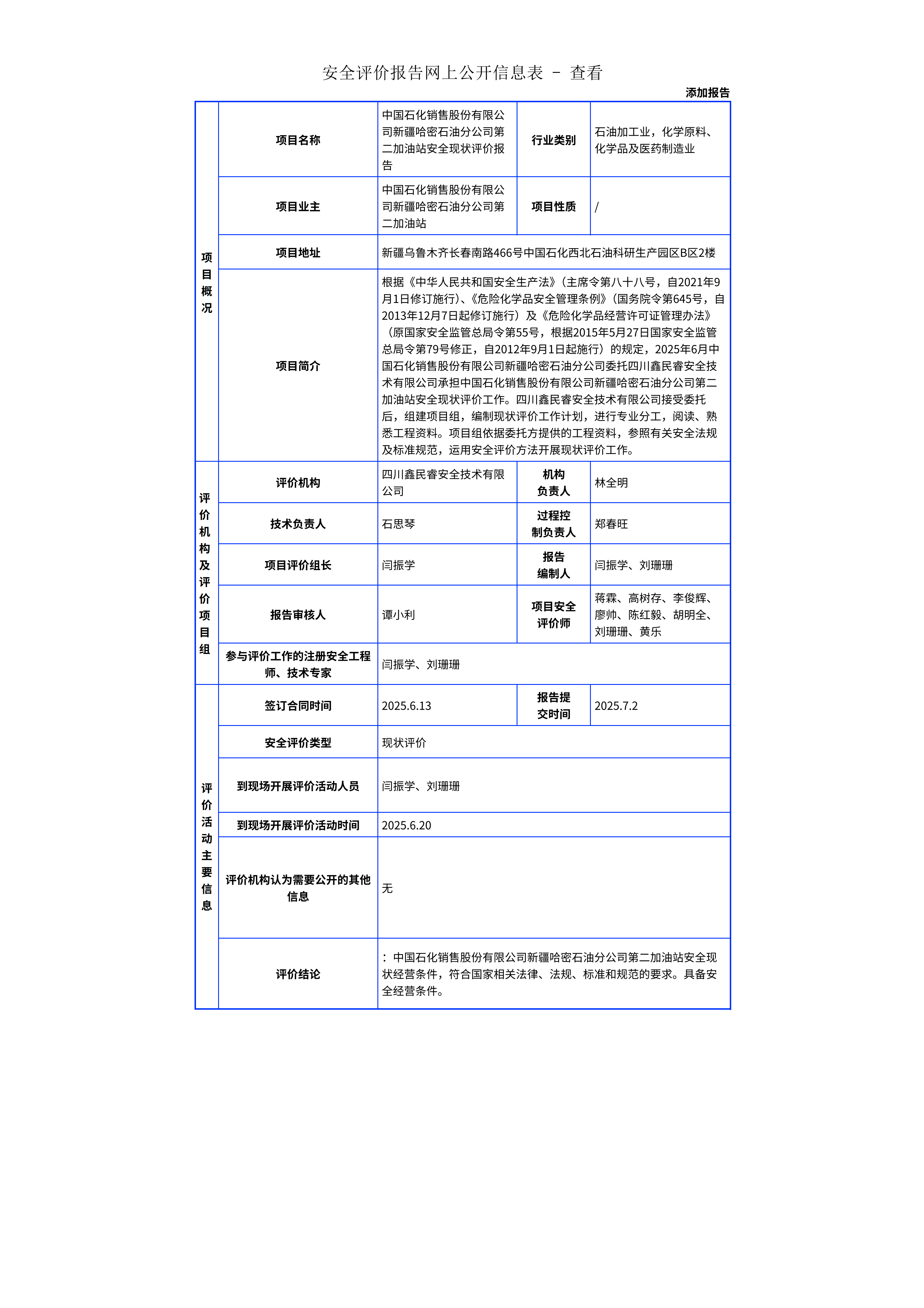 252中国石化销售股份有限公司新疆哈密石油分公司第二加油站安全现状评价报告