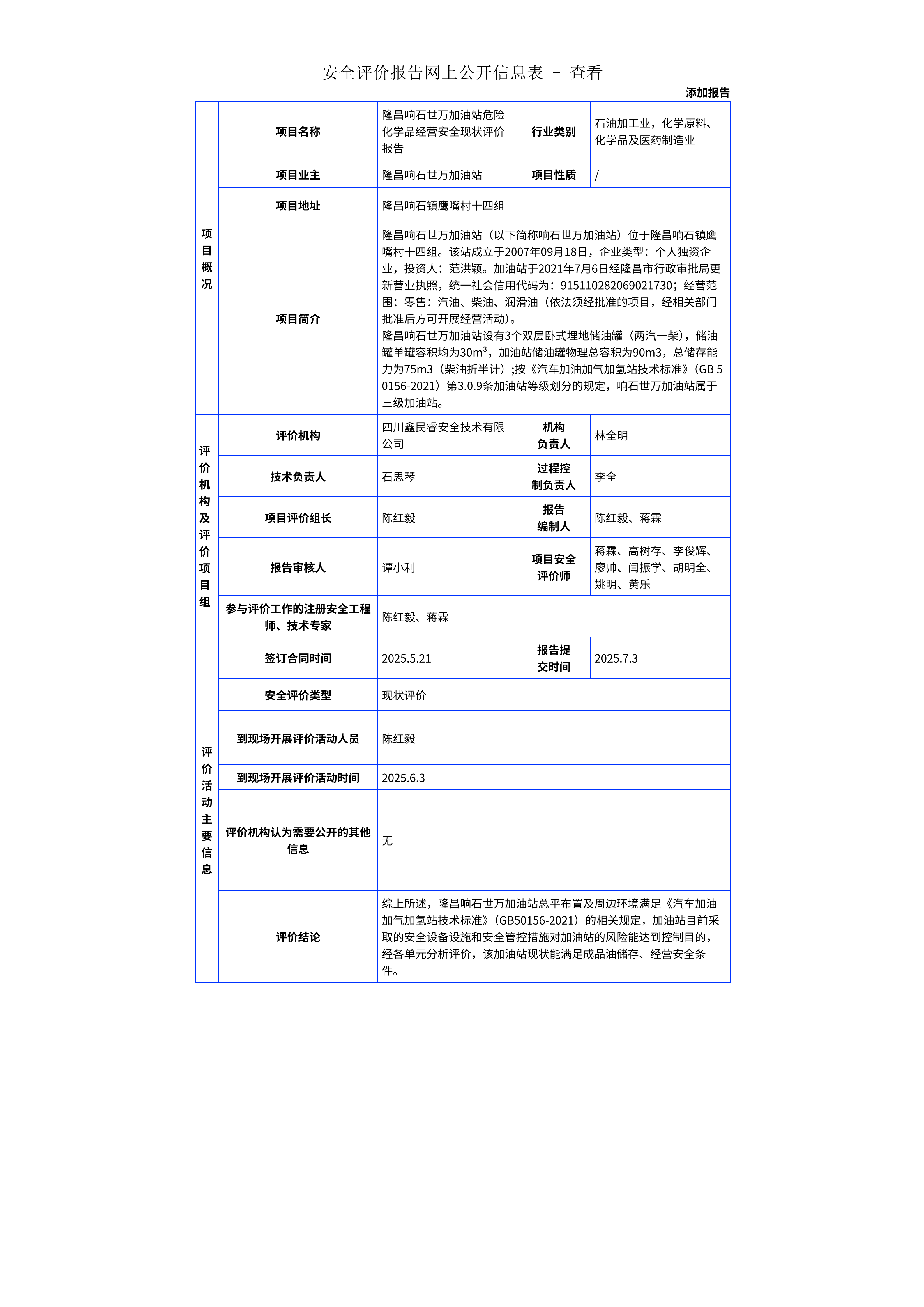 253隆昌响石世万加油站危险化学品经营安全现状评价报告