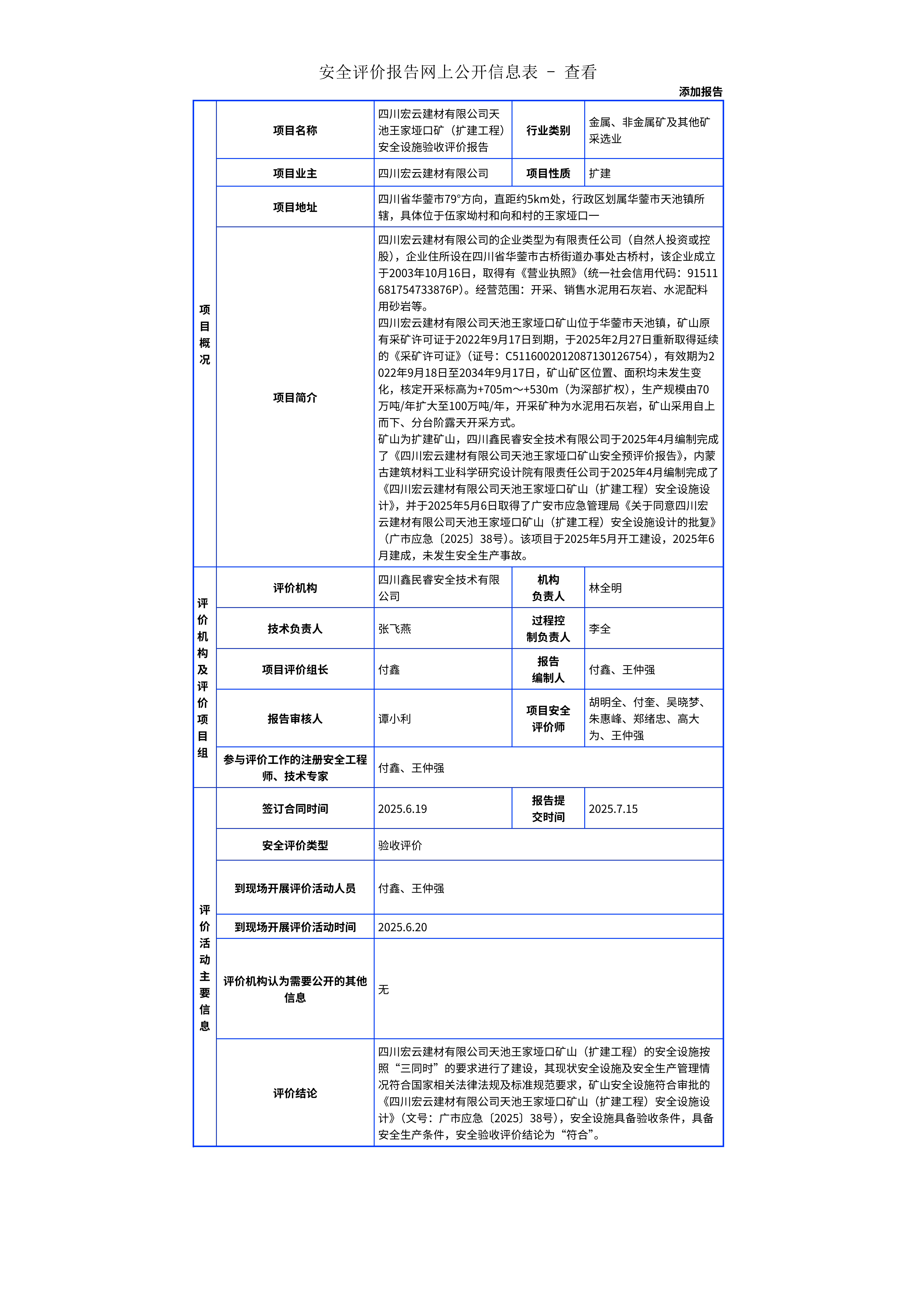 254四川宏云建材有限公司天池王家垭口矿(扩建工程)安全设施验收评价报告