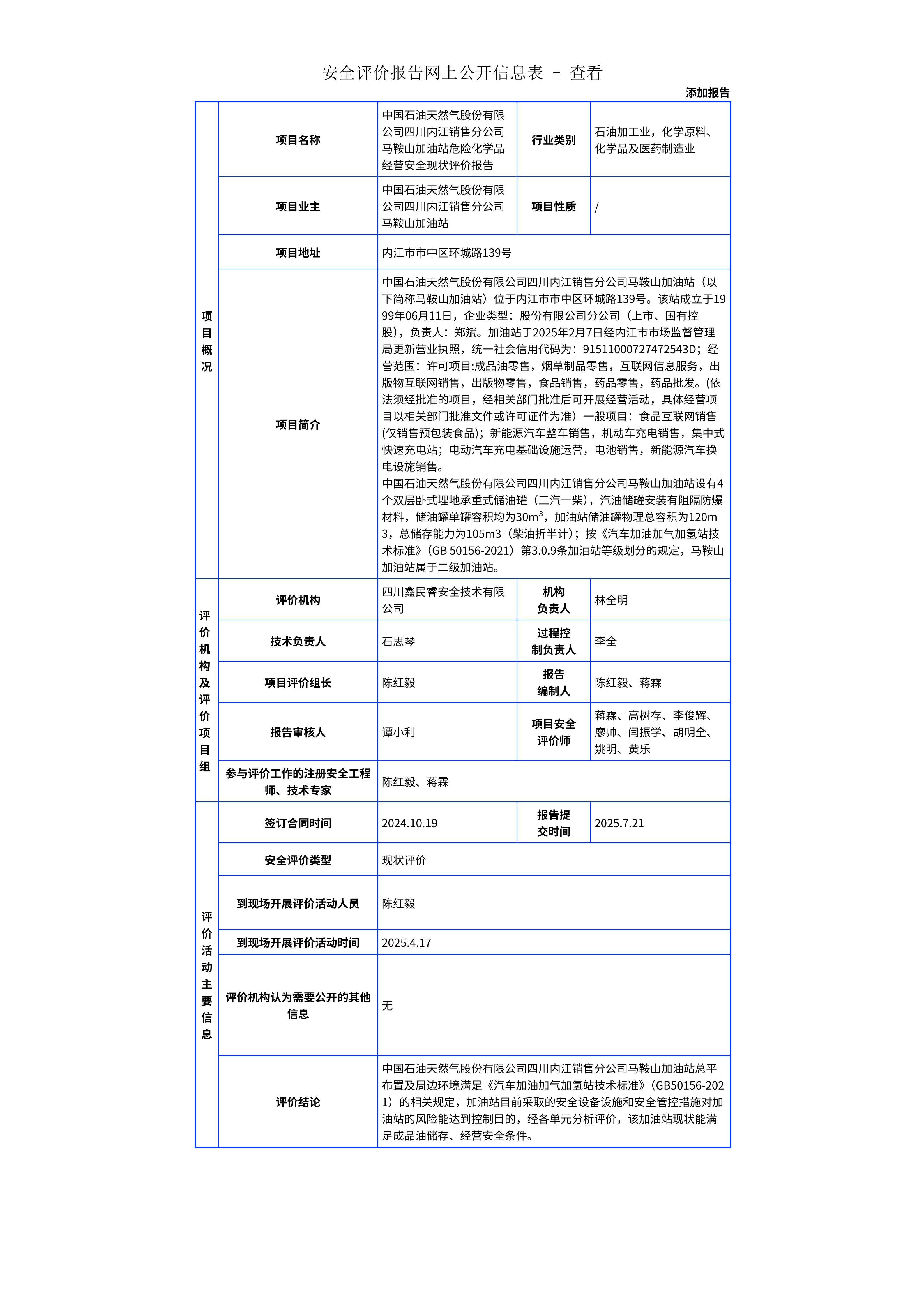 256中国石油天然气股份有限公司四川内江销售分公司马鞍山加油站危险化学品经营安全现状评价报告