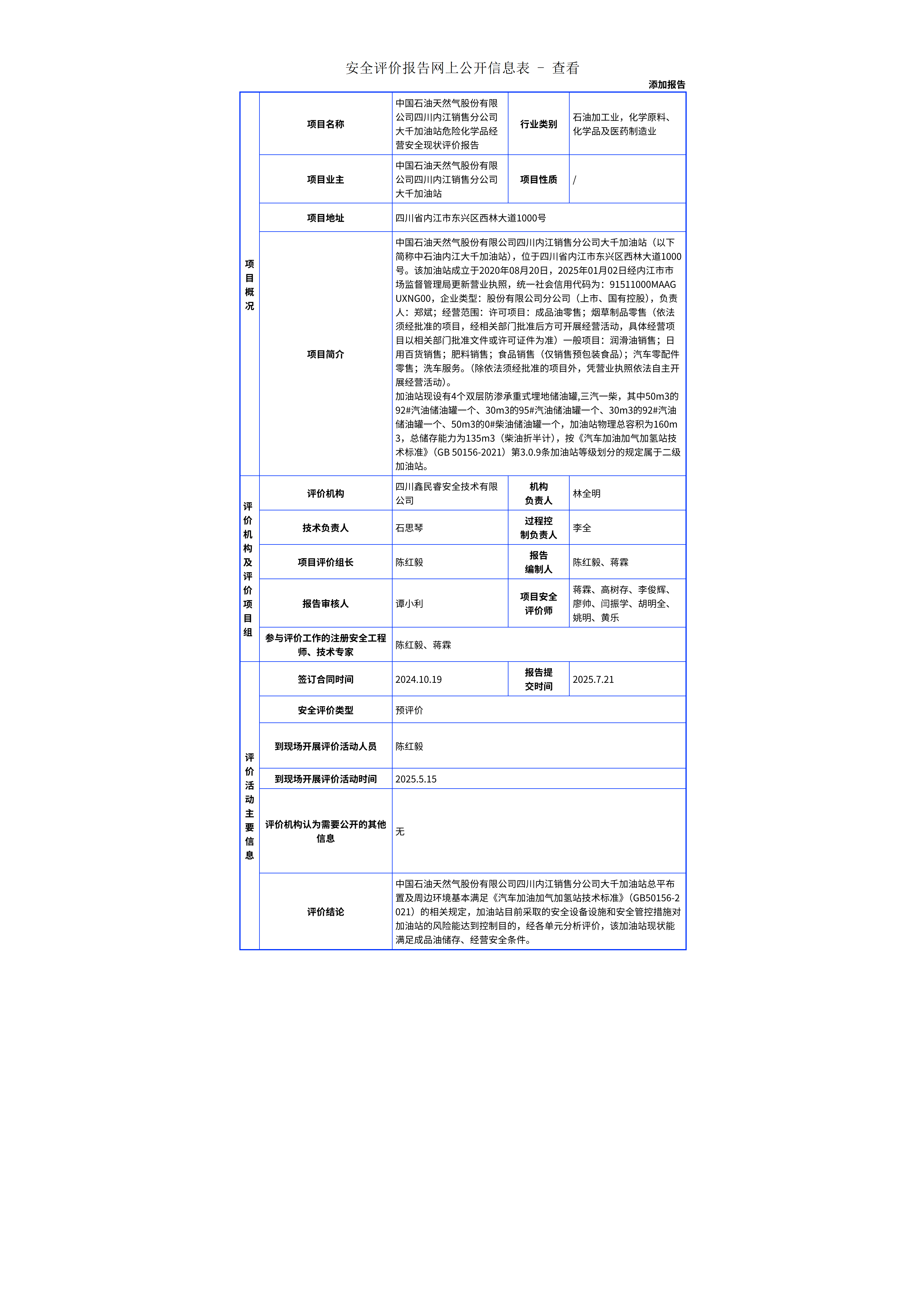 260中国石油天然气股份有限公司四川内江销售分公司大千加油站危险化学品经营安全现状评价报告