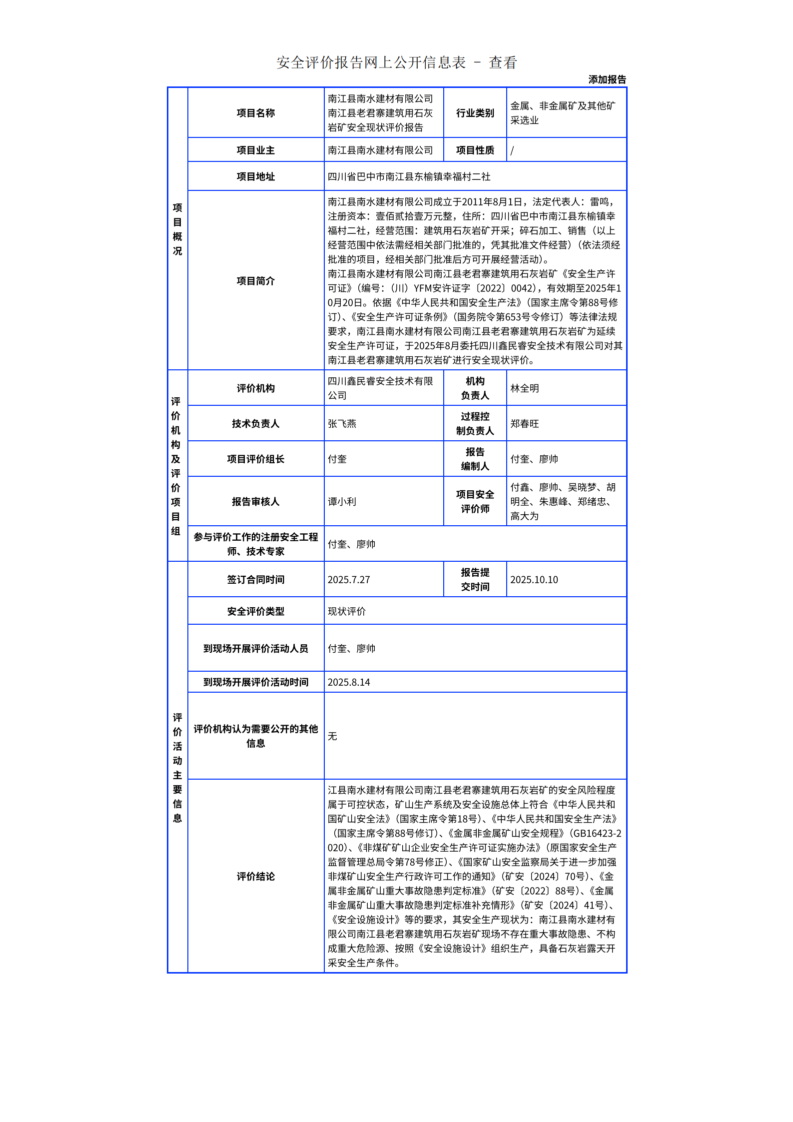 264南江县南水建材有限公司南江县老君寨建筑用石灰岩矿安全现状评价报告