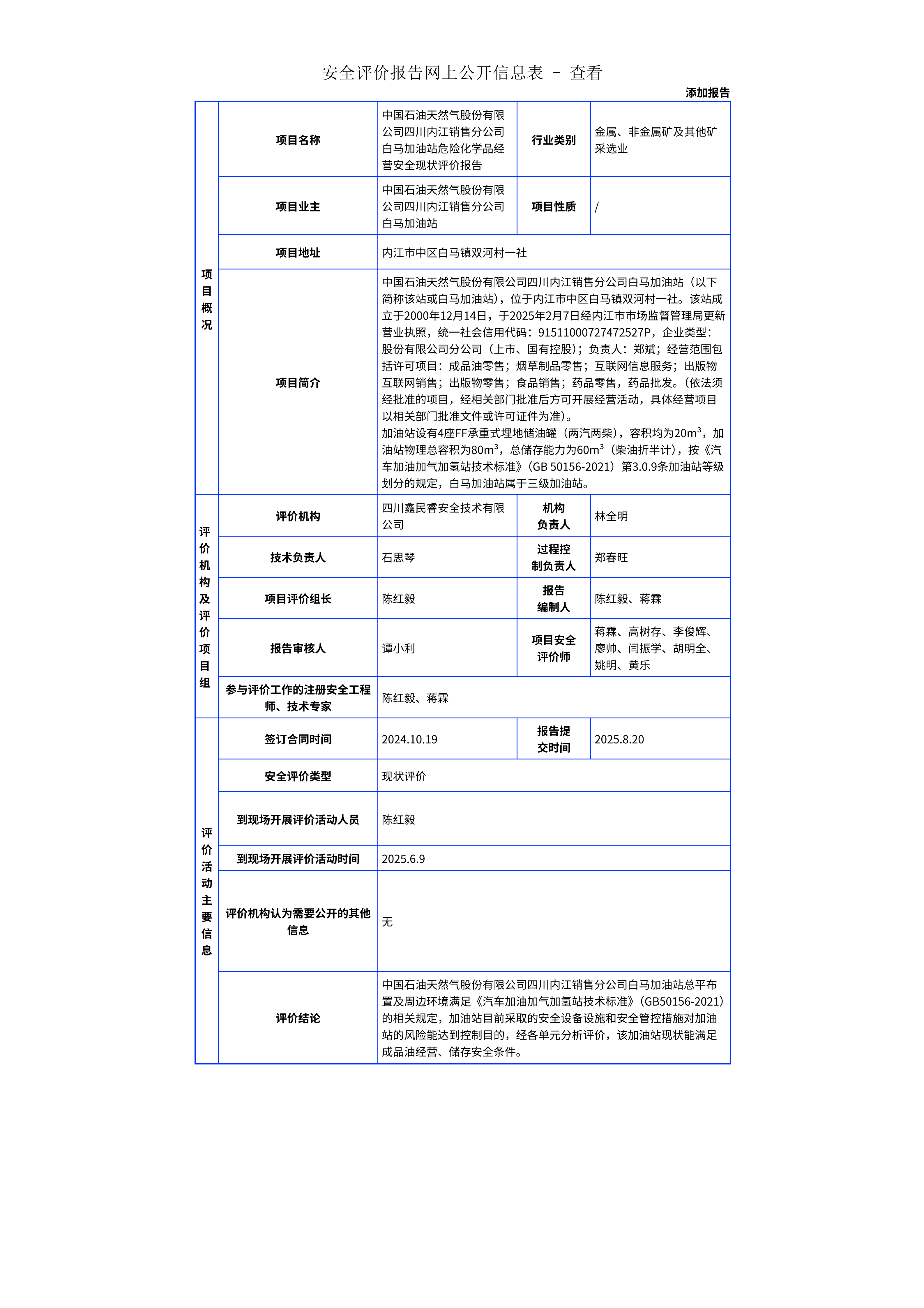 265中国石油天然气股份有限公司四川内江销售分公司白马加油站危险化学品经营安全现状评价报告