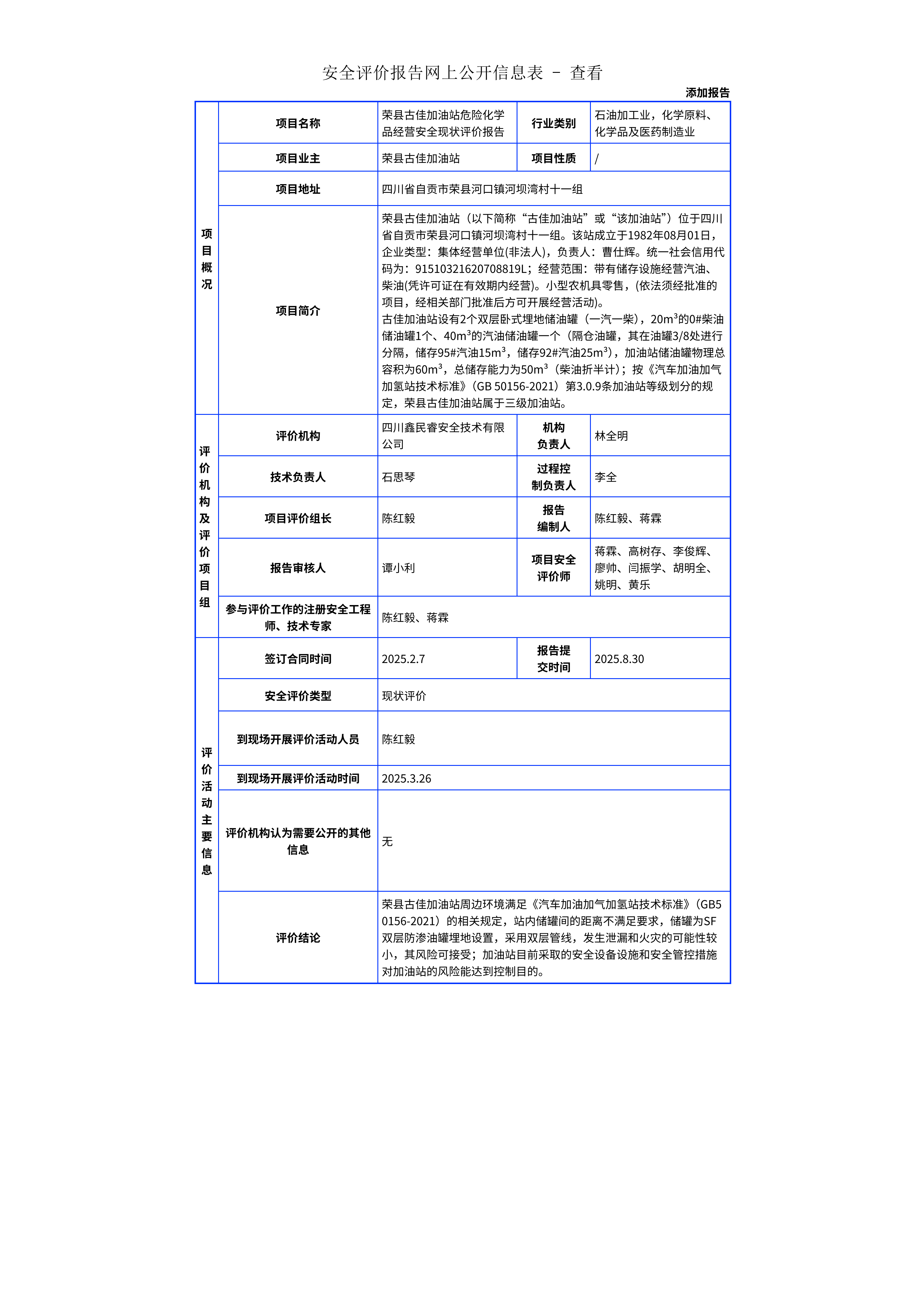 270荣县古佳加油站危险化学品经营安全现状评价报告
