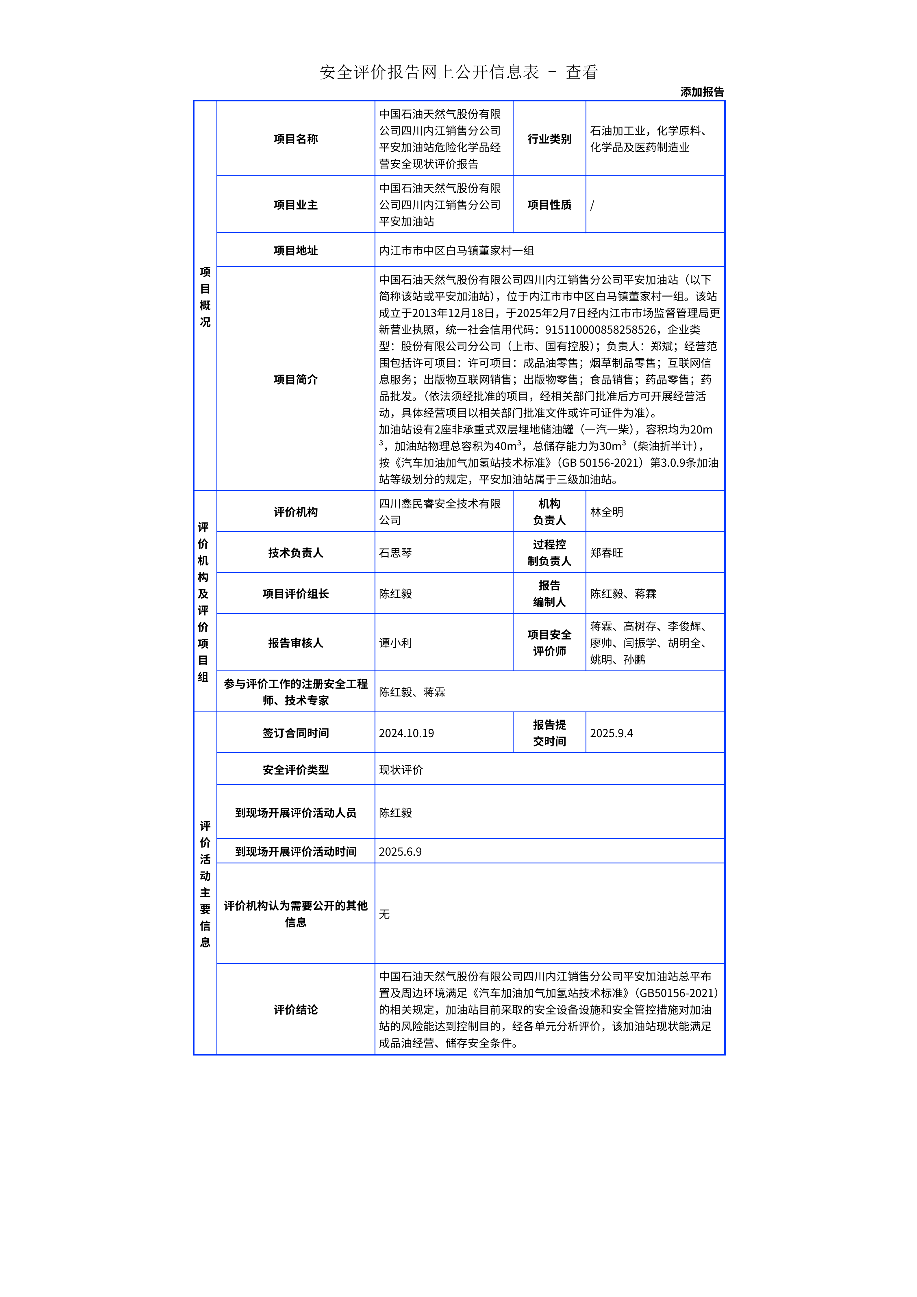 273中国石油天然气股份有限公司四川内江销售分公司平安加油站危险化学品经营安全现状评价报告