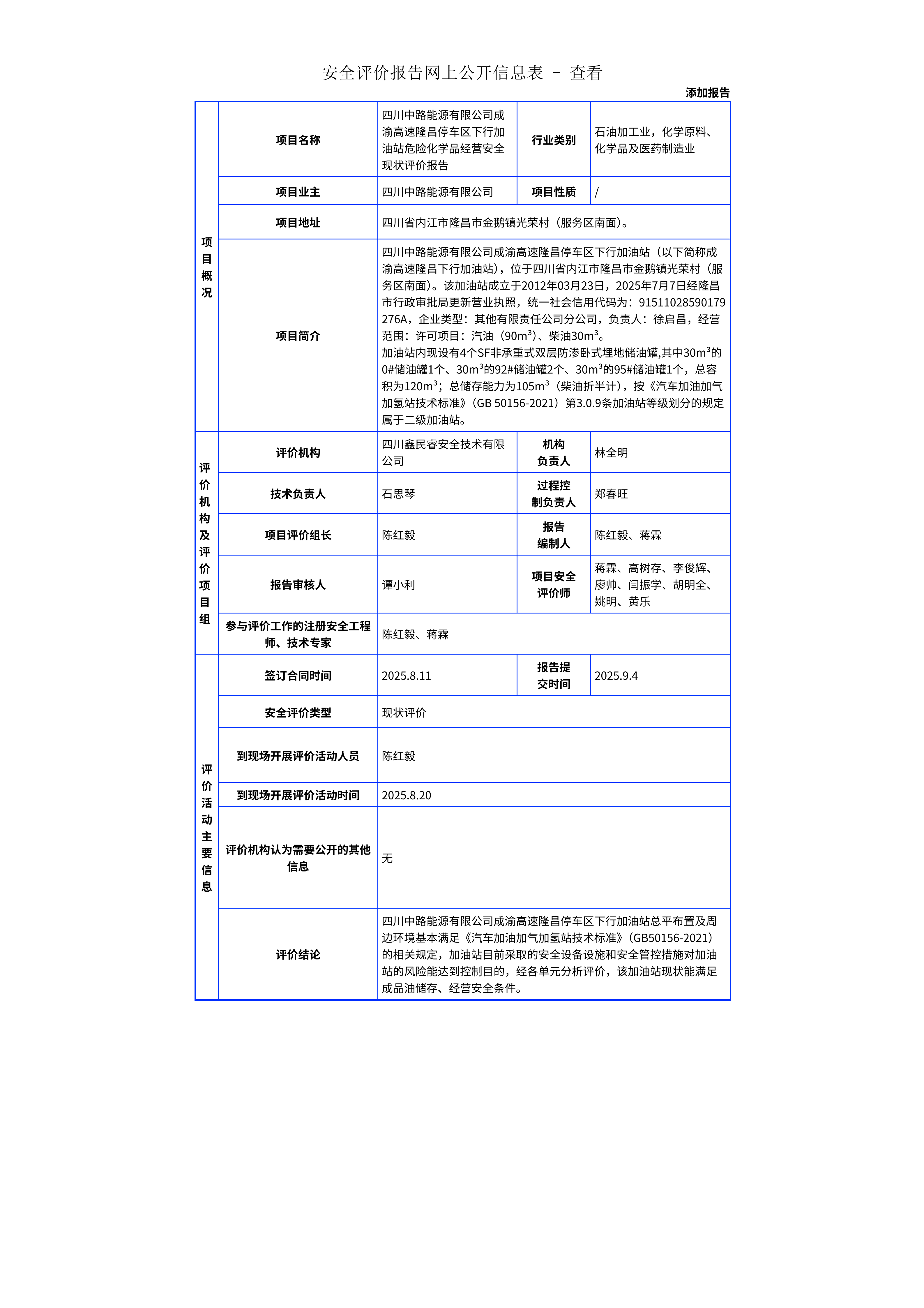 275四川中路能源有限公司成渝高速隆昌停车区下行加油站危险化学品经营安全现状评价报告