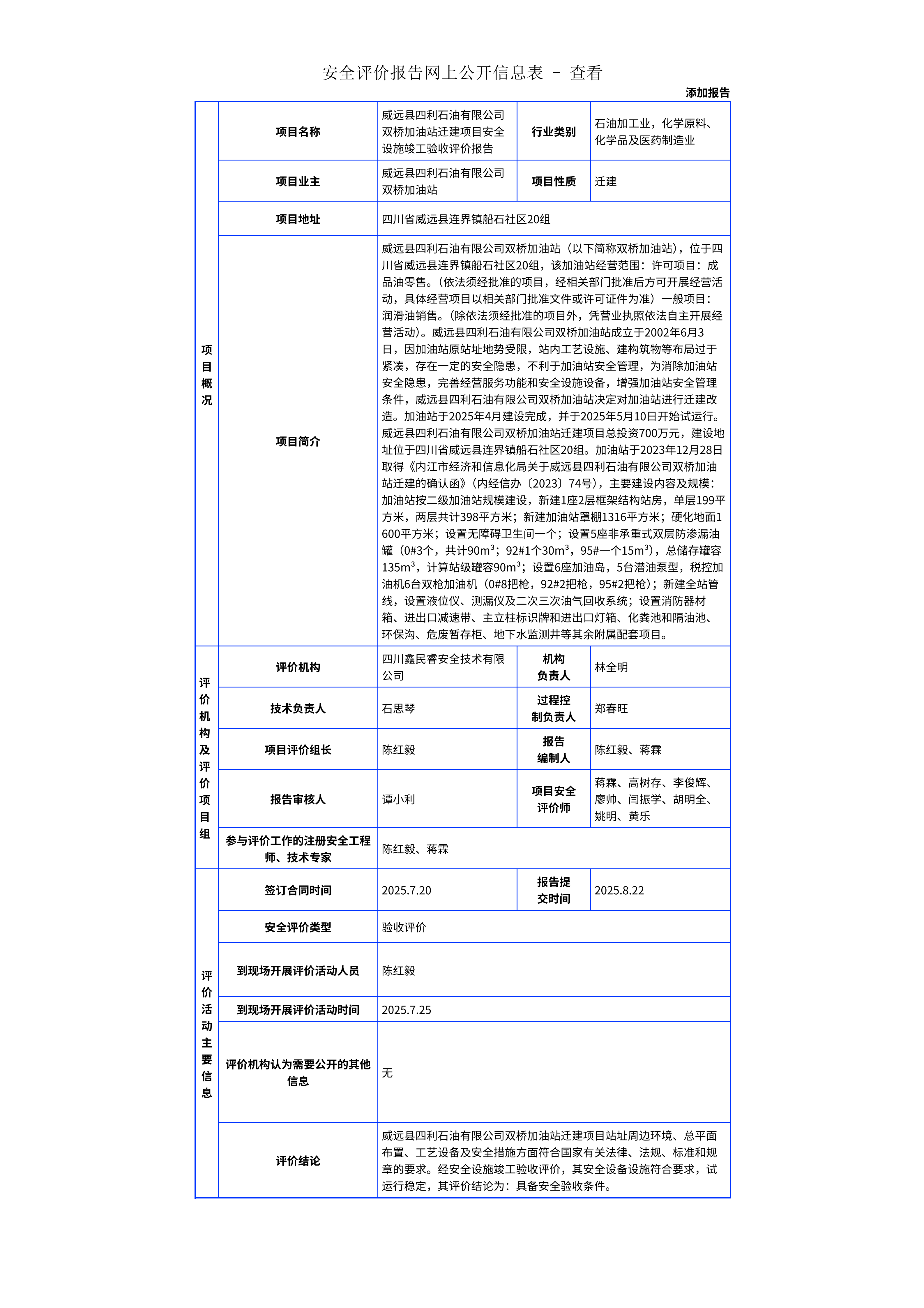 281威远县四利石油有限公司双桥加油站迁建项目安全设施竣工验收评价报告