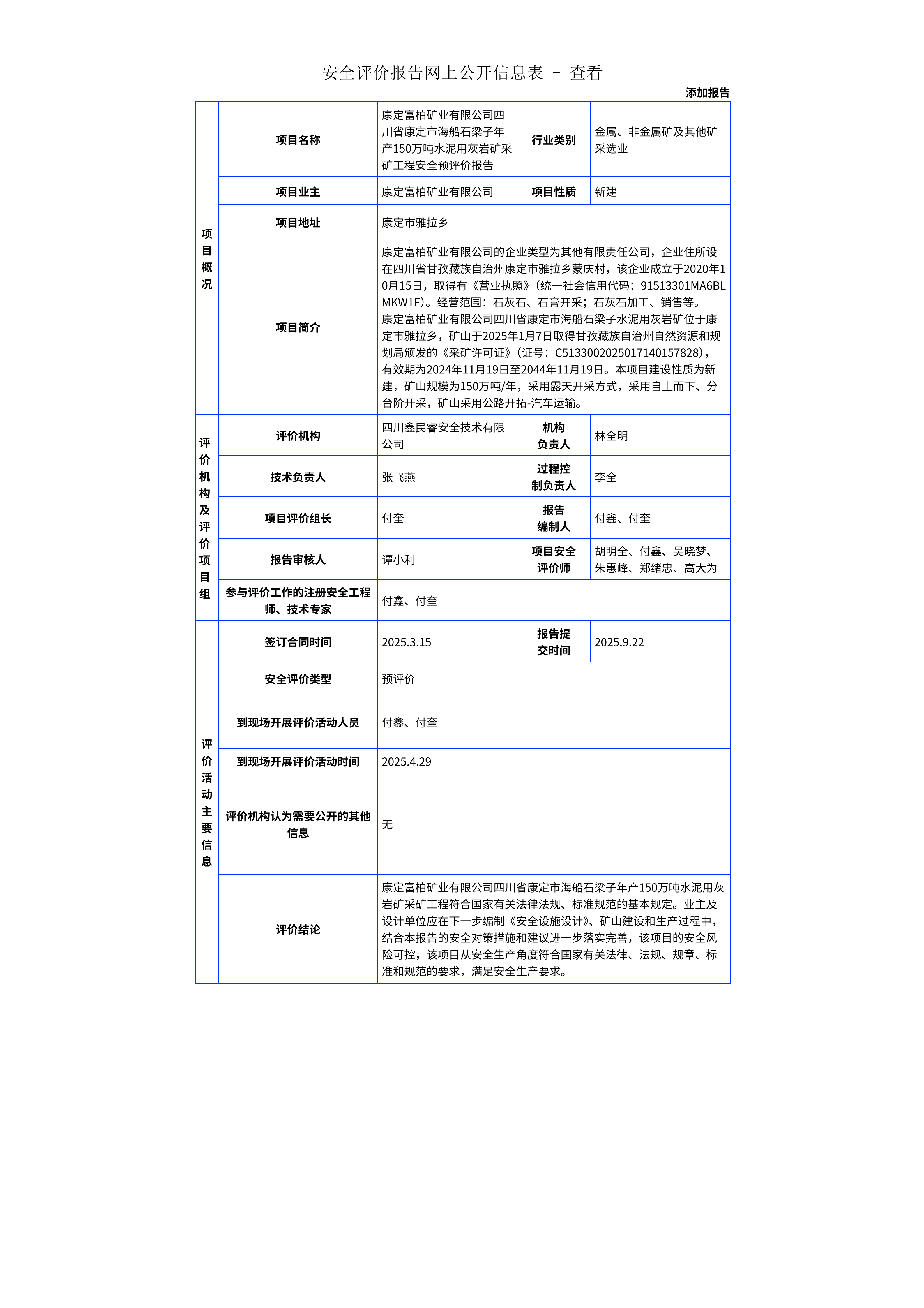 288康定富柏矿业有限公司四川省康定市海船石梁子年产150万吨水泥用灰岩矿采矿工程安全预评价报告