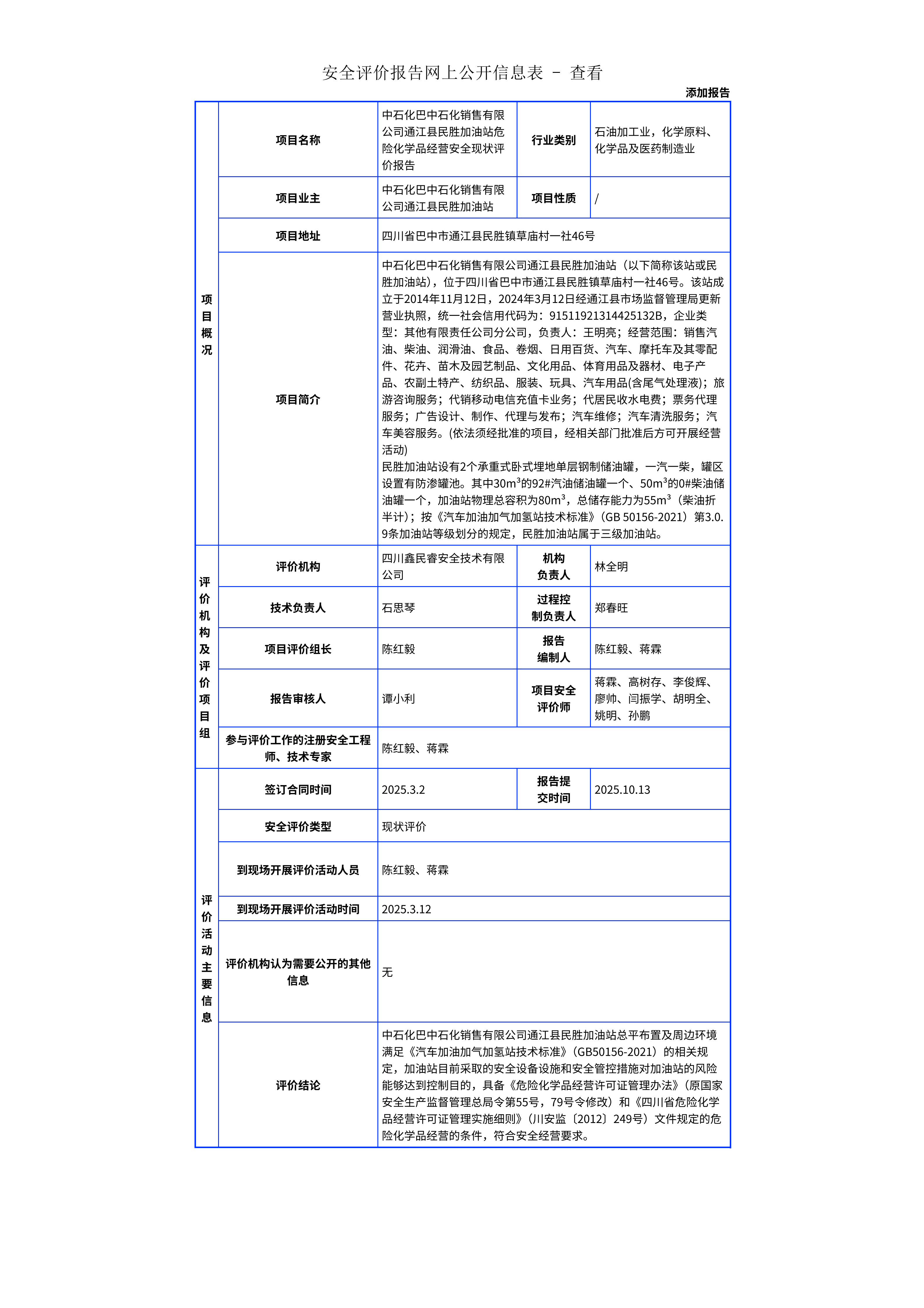 297中石化巴中石化销售有限公司通江县民胜加油站危险化学品经营安全现状评价报告 报告