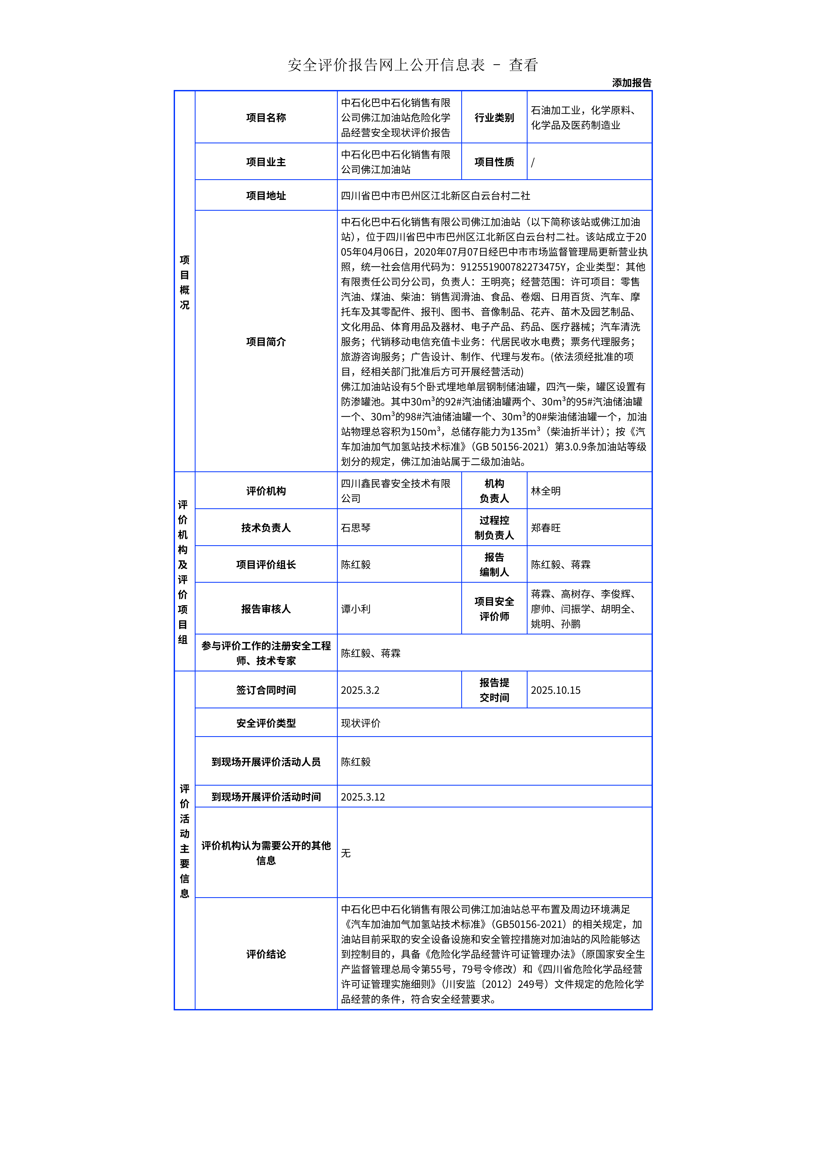 298中石化巴中石化销售有限公司佛江加油站危险化学品经营安全现状评价报告