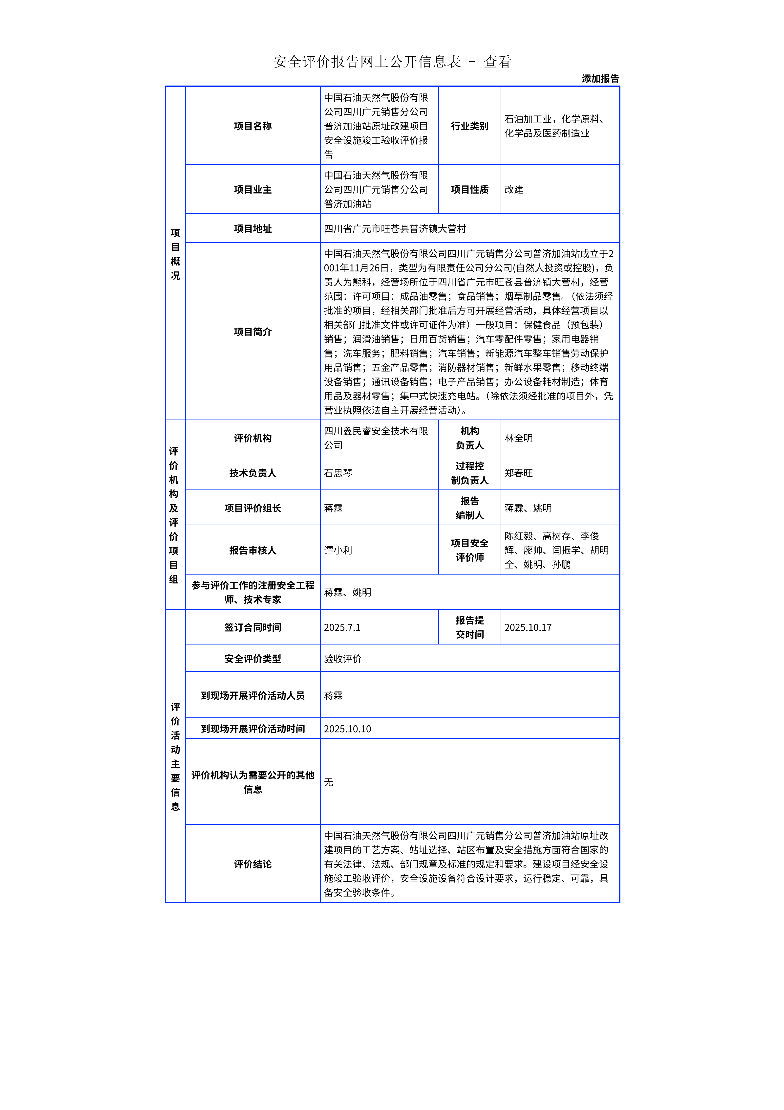 302中国石油天然气股份有限公司四川广元销售分公司普济加油站原址改建项目安全设施竣工验收评价报告