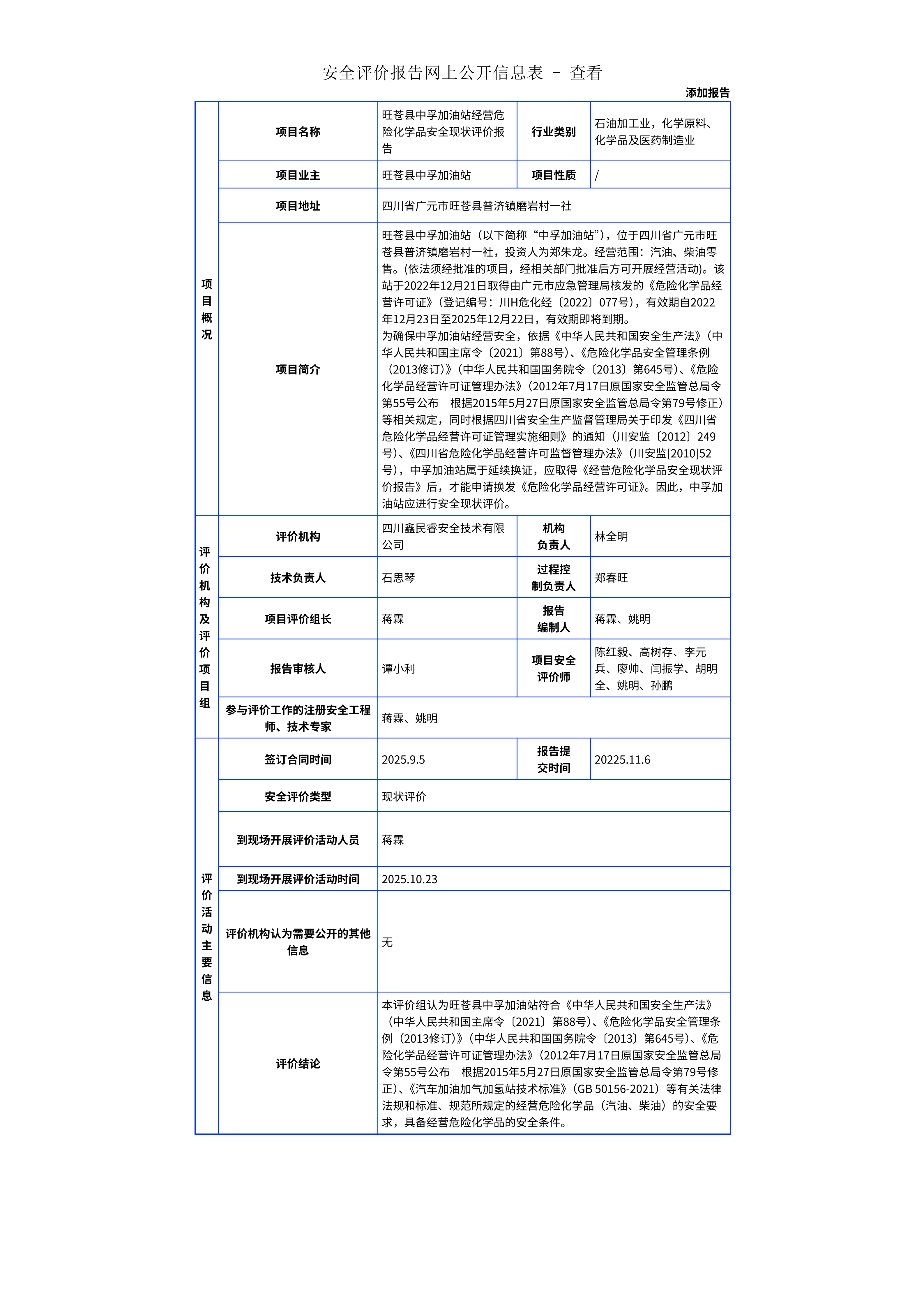 315旺苍县中孚加油站经营危险化学品安全现状评价报告