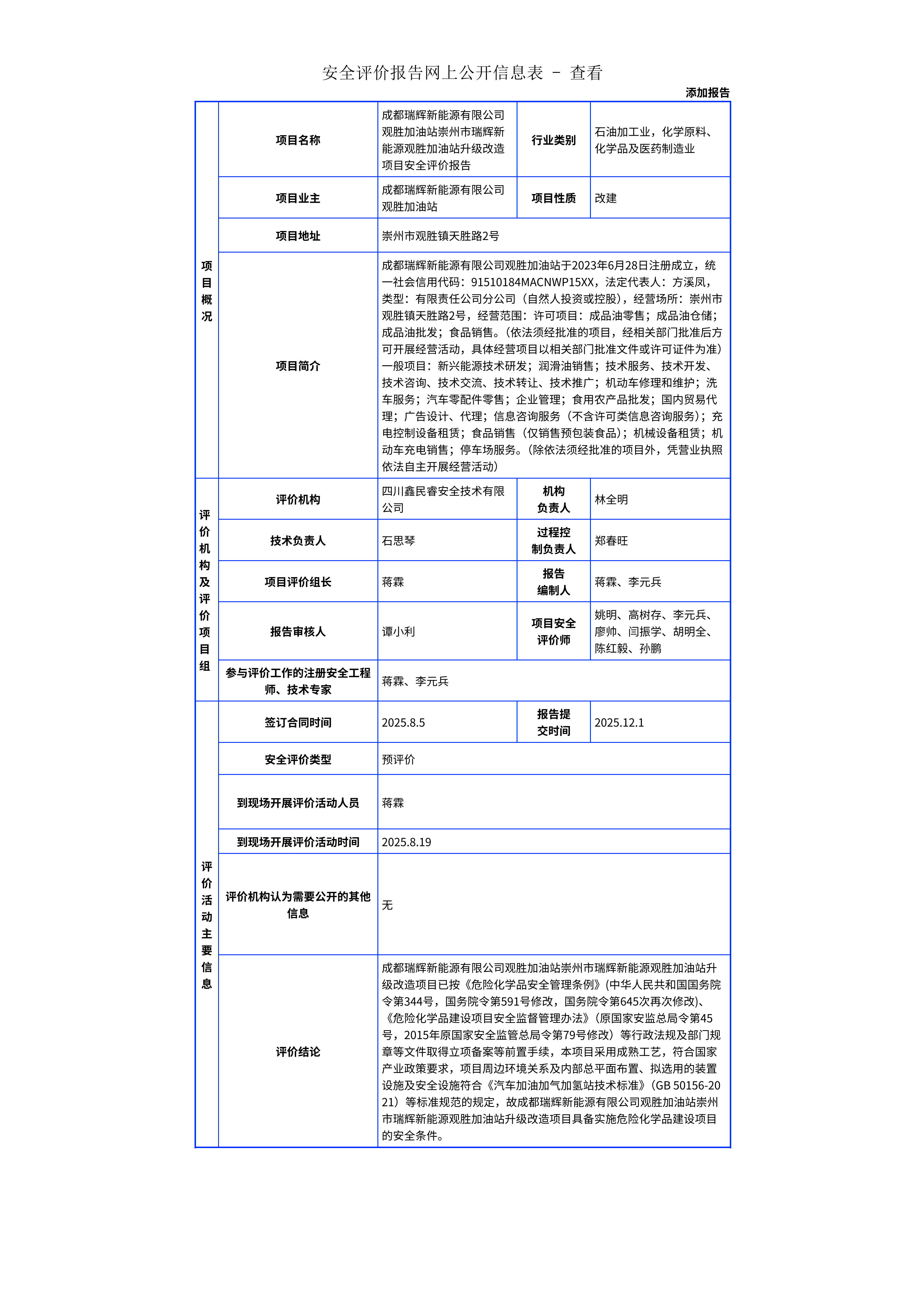 325成都瑞辉新能源有限公司观胜加油站崇州市瑞辉新能源观胜加油站升级改造项目安全评价报告