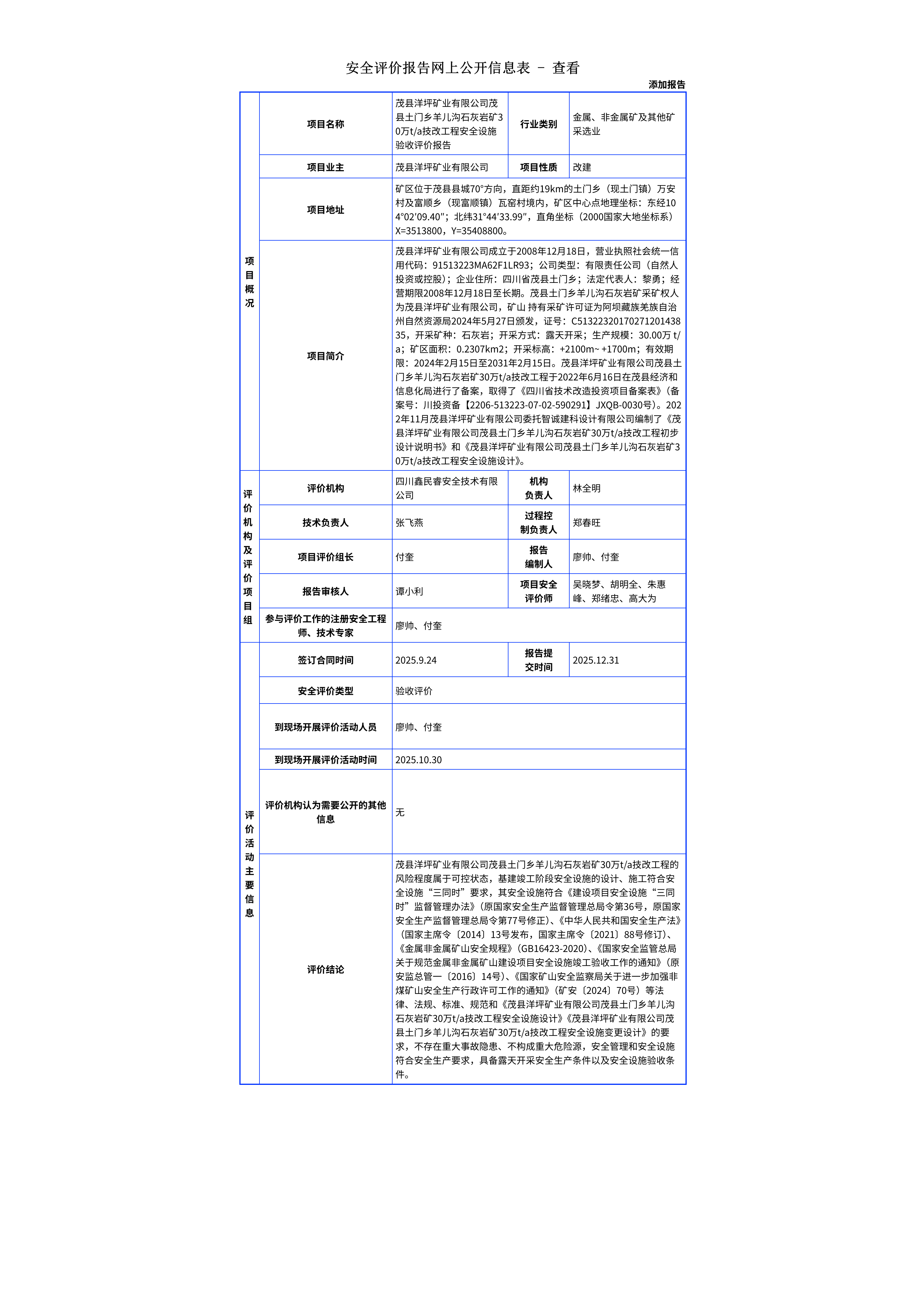 338茂县洋坪矿业有限公司茂县土门乡羊儿沟石灰岩矿30万ta技改工程安全设施验收评价报告