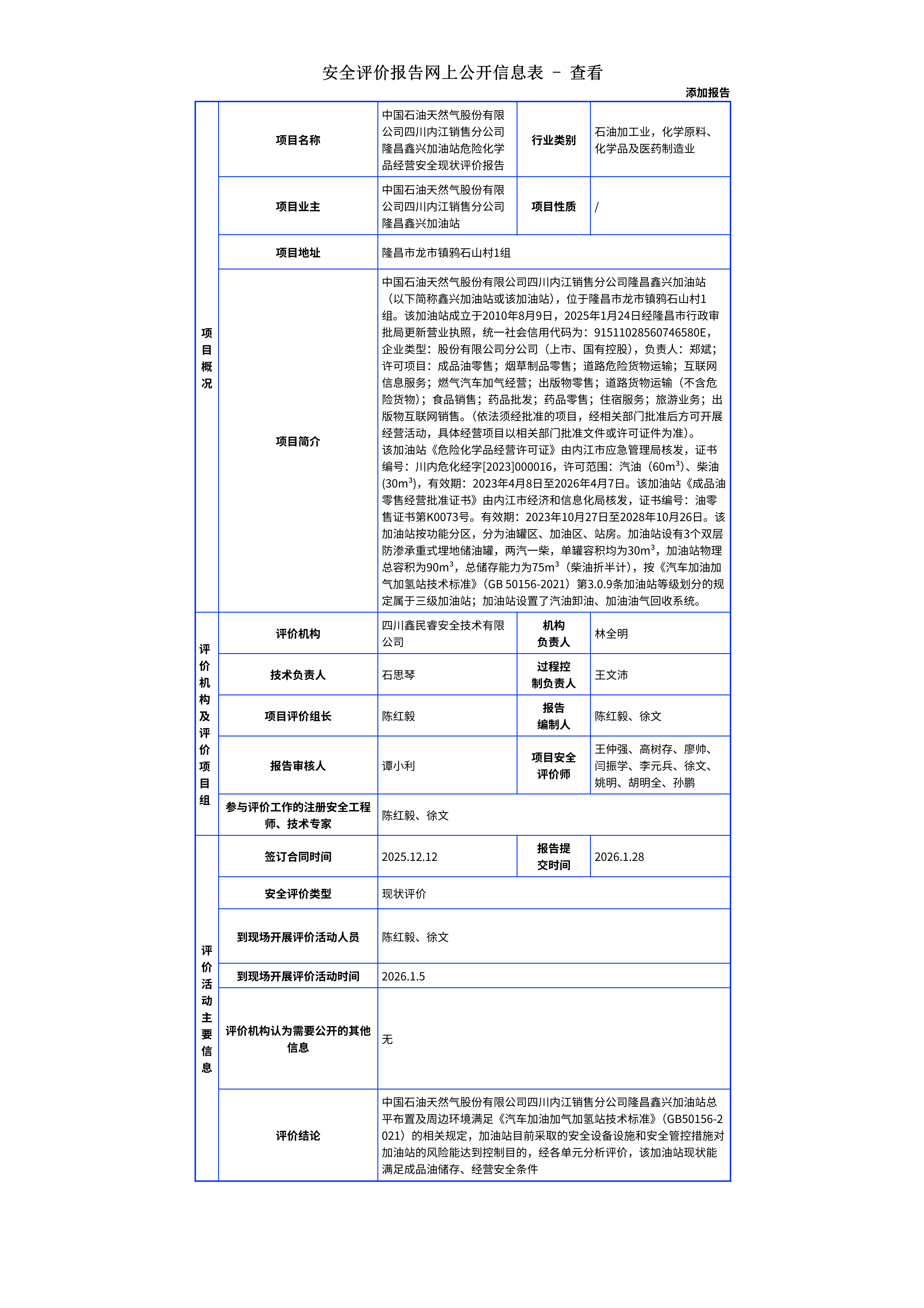346中国石油天然气股份有限公司四川内江销售分公司隆昌鑫兴加油站危险化学品经营安全现状评价报告